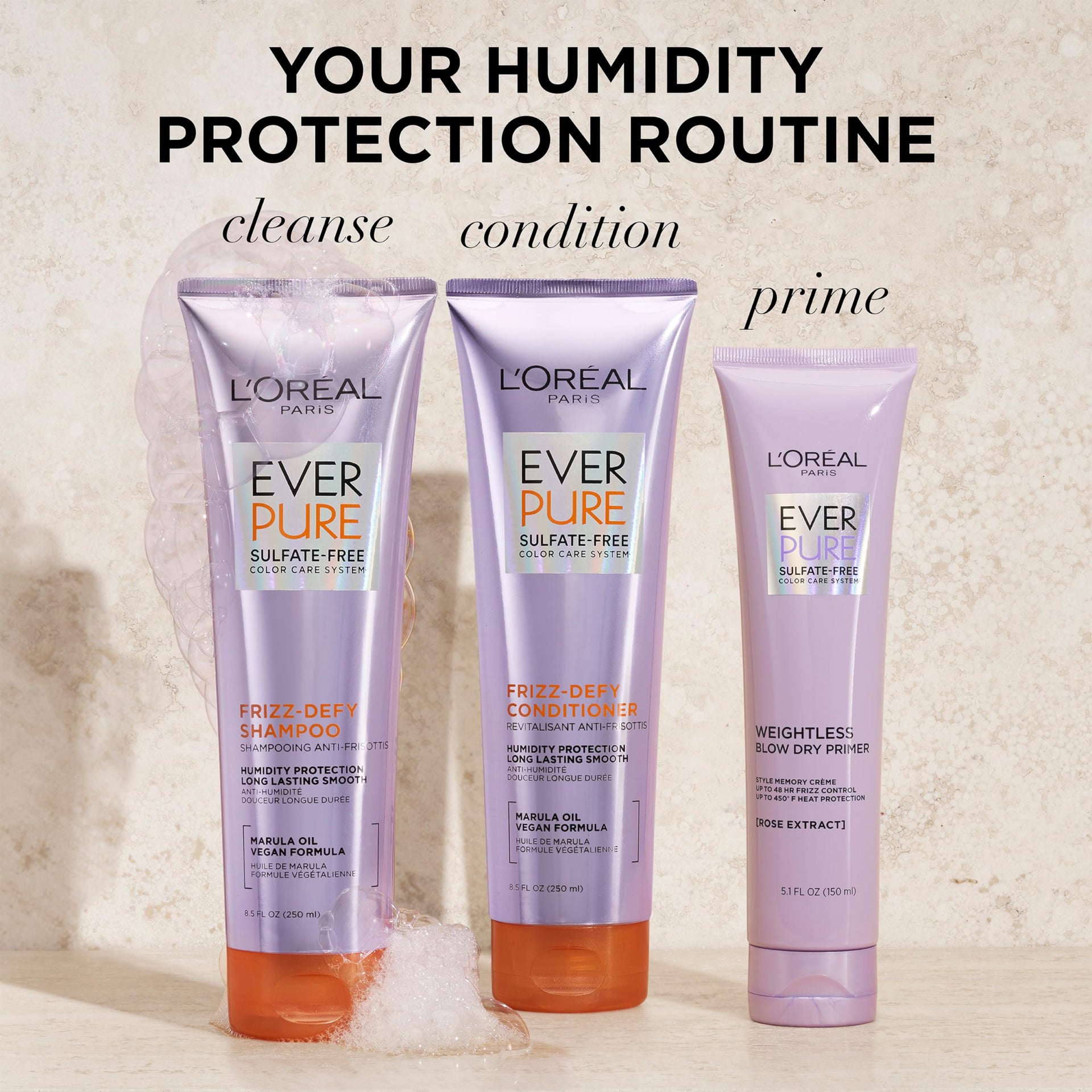 Details: L’Oréal Paris EverPure Frizz-Defy Sulfate Free Shampoo and Conditioner with Marula Oil gently cleanses frizzy hair for humidity protection and frizz resistance up to 24 hours. Our formulas are especially gentle on color treated hair. Experience a purely sensorial rich, creamy formula and a fresh aromatic fragrance that blooms. For best use, after using Frizz Defy Shampoo, apply Frizz Defy Conditioner to hair. Leave on for one to two minutes before rinsing. Follow with EverSleek Frizz Finish. EverPure hair products have the purest respect for your hair and have been formulated without sulfates, parabens, DMDM hydantoin, added phthalates, dyes and gluten ingredients. Always color caring and powered by science.