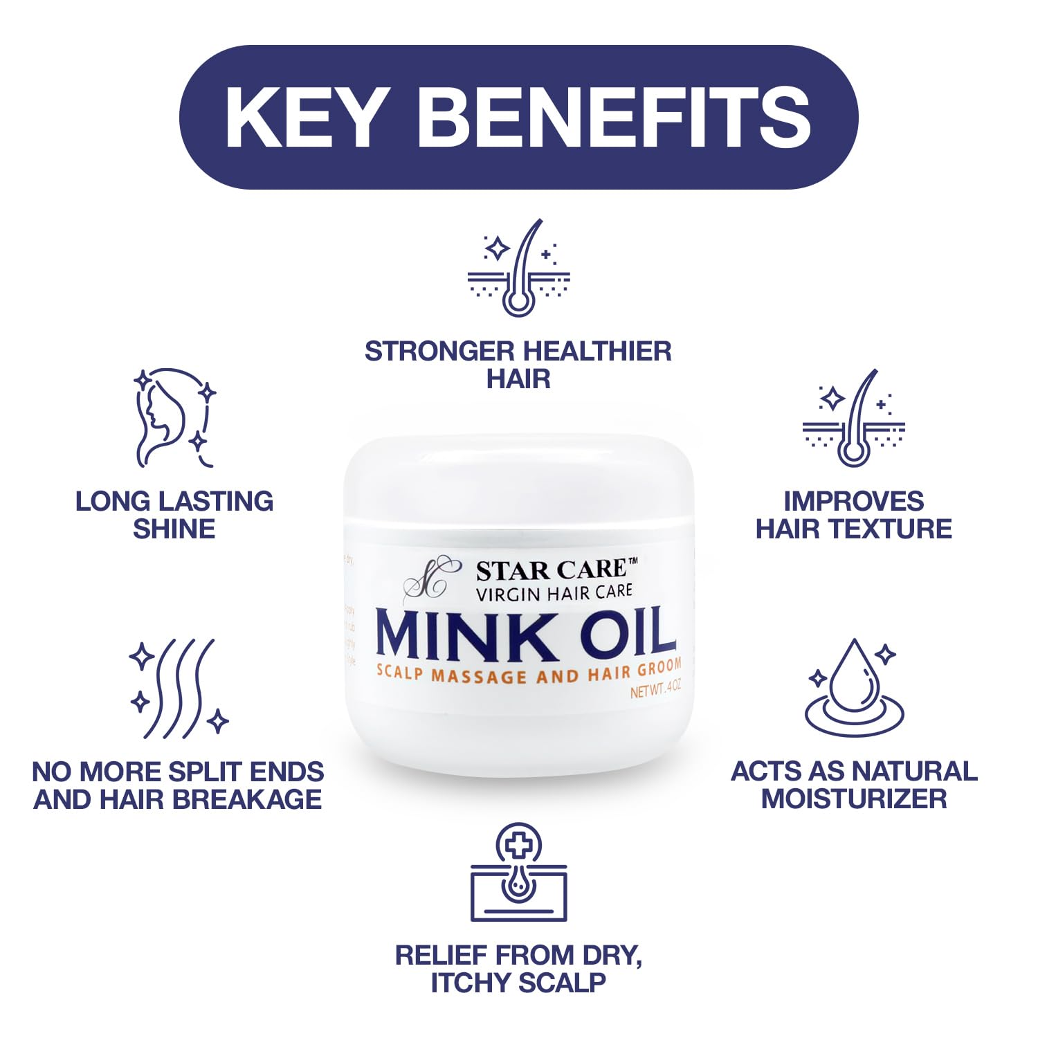 Star Care Virgin Hair Care Mink Oil 4oz Daily use will help to relieve dry, itchy scalp and help promote healthy hair. Scalp massage Hair groom