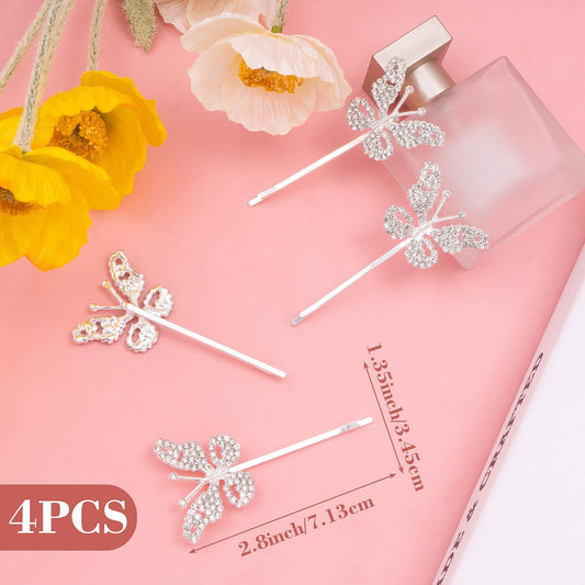 HINZIC 4 Pack Non-Slip Butterfly Hair Clips, Glittering Rhinestone Headwear Styling Bobby Pins, Sparkling Diamond Hairgrip Barrettes Accessories