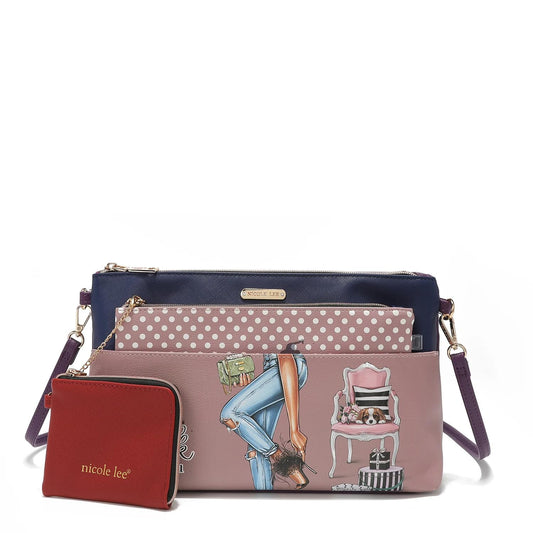 NICOLE LEE 3 Pieces Handbag Pouch Set, Removable Crossbody Strap, Large, Medium Small Zip Pouches, Travel Set (Be My Valentine)