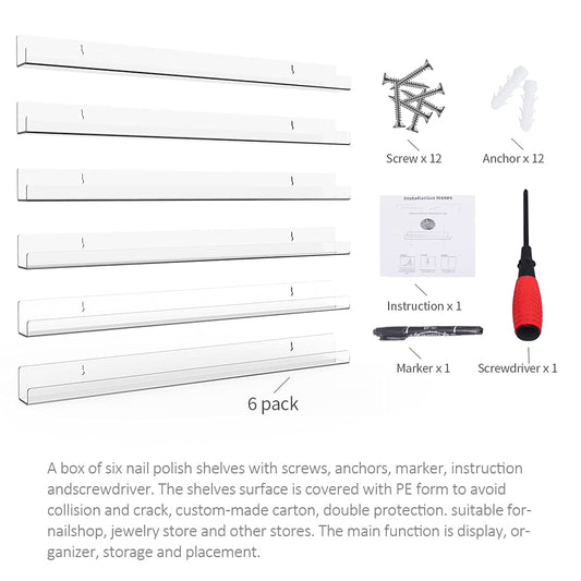 Sezanrpt 32 Inches Acrylic Nail Polish Rack Shelf for Wall, Clear Nail Polish Organizer Wall Mounted for 192 Bottles, 6 Pack