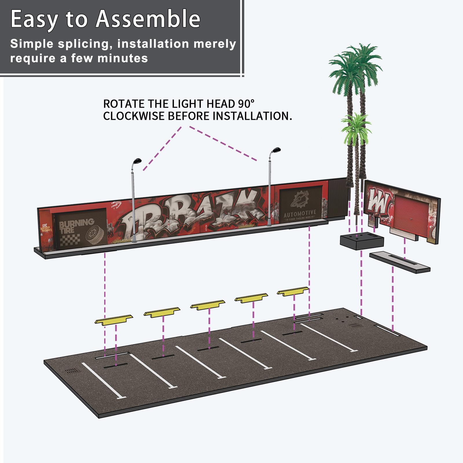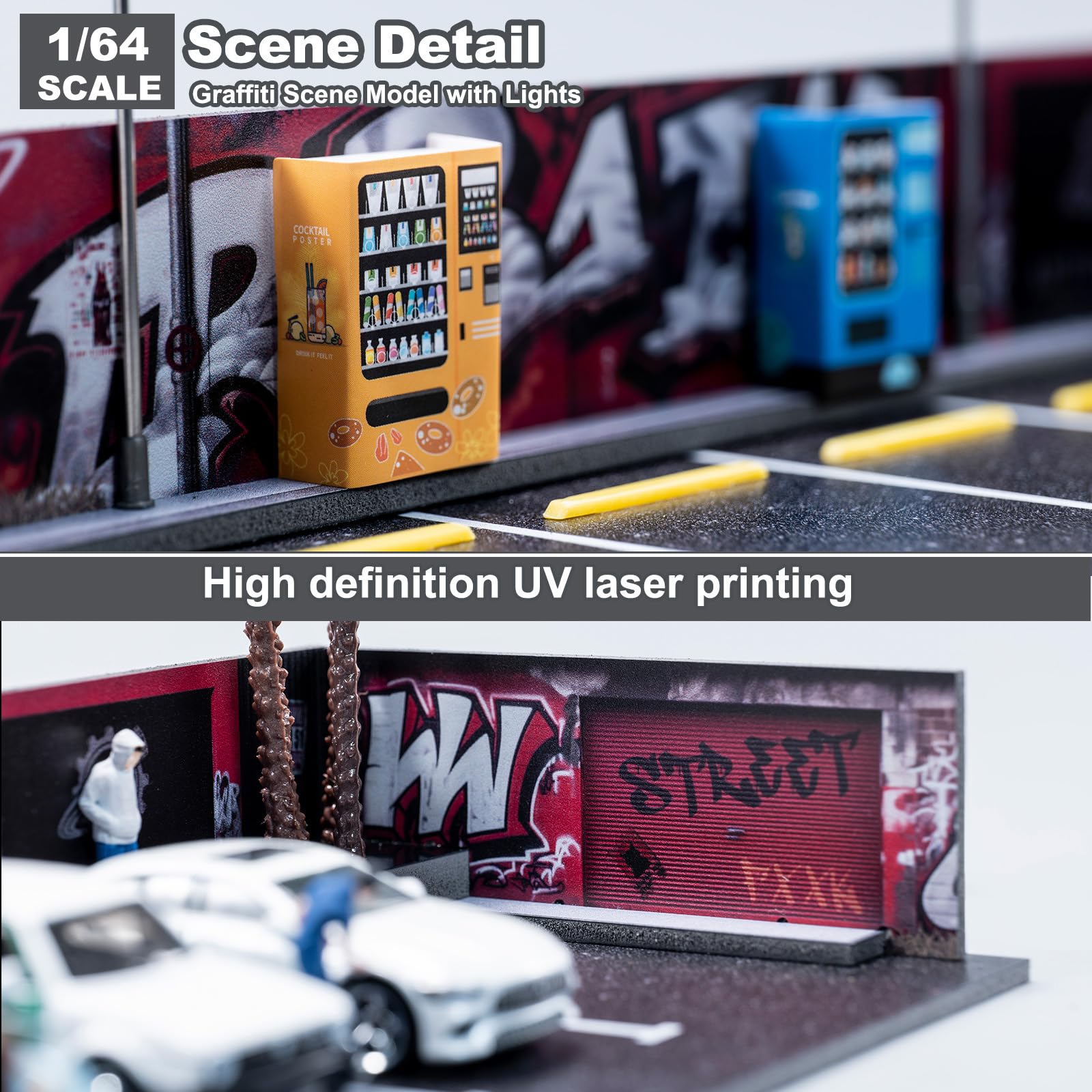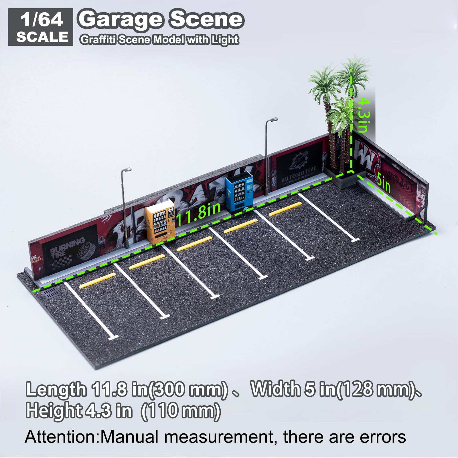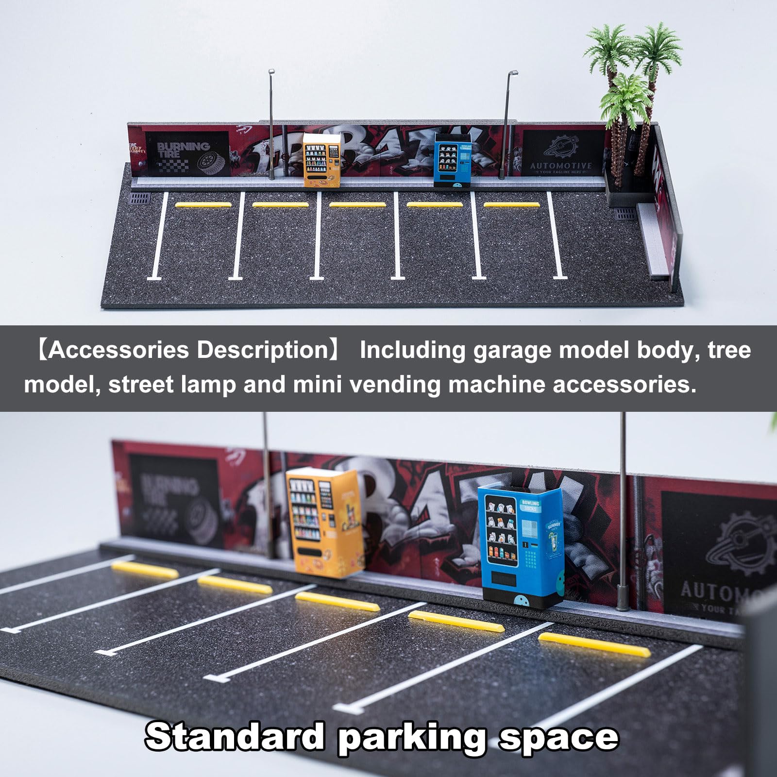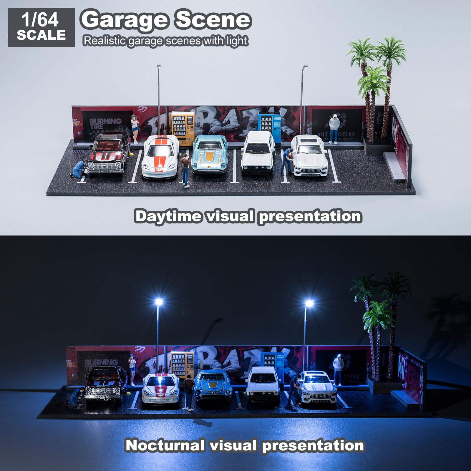 1/64 Diorama Garage, Garage and Display Case for Model Car, Scenic Diorama Display Car Park with 2 LED Street Lamps and 5 Outdoor Parking Spaces