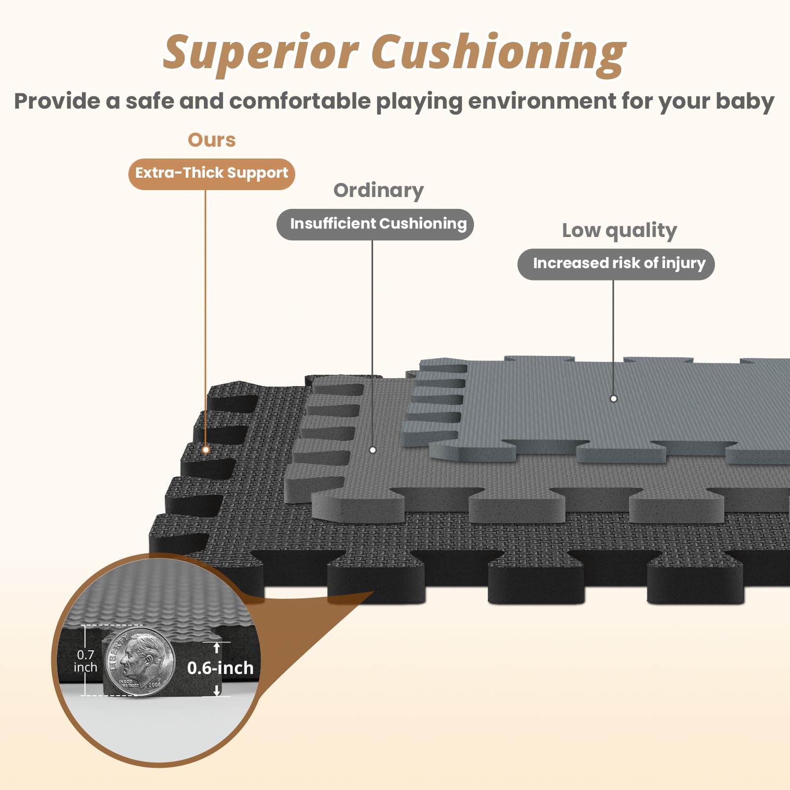 - 36 Square Feet: The baby floor play mat is assembled to be 72*72 inches, providing ample space for the baby to play.