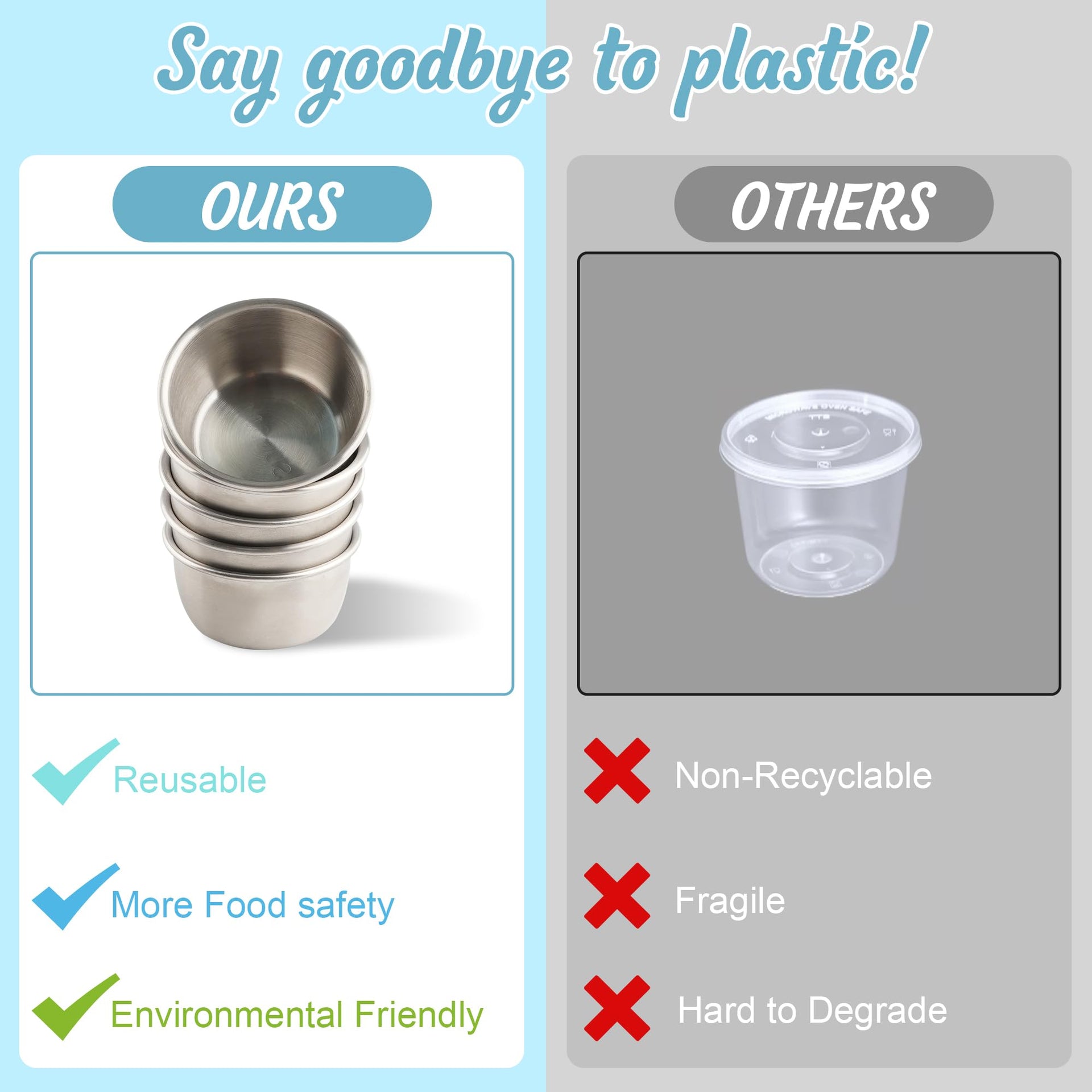- 【SAFE AND RELIABLE MATERIAL】: The small container with lid is made of quality 304 stainless steel and food-grade safe silicone, which makes our sauce cup non-toxic, dishwasher safe, freezer safe and durable enough for long-termism lifestyle. Our salad container for lunch can completely replace disposable containers, reduce the use of plastic and achieve environmental protection