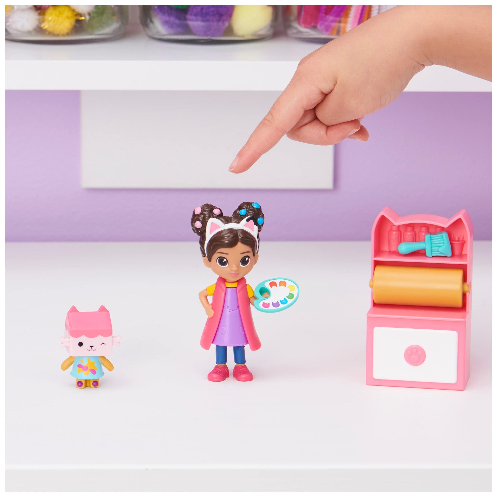 - DOLL WITH ACTION FEATURE: Press down on the Gabby Girl collectible figure’s cat ears to make Gabby’s artist smock transform from clean to paint-splattered Press down again to make it clean