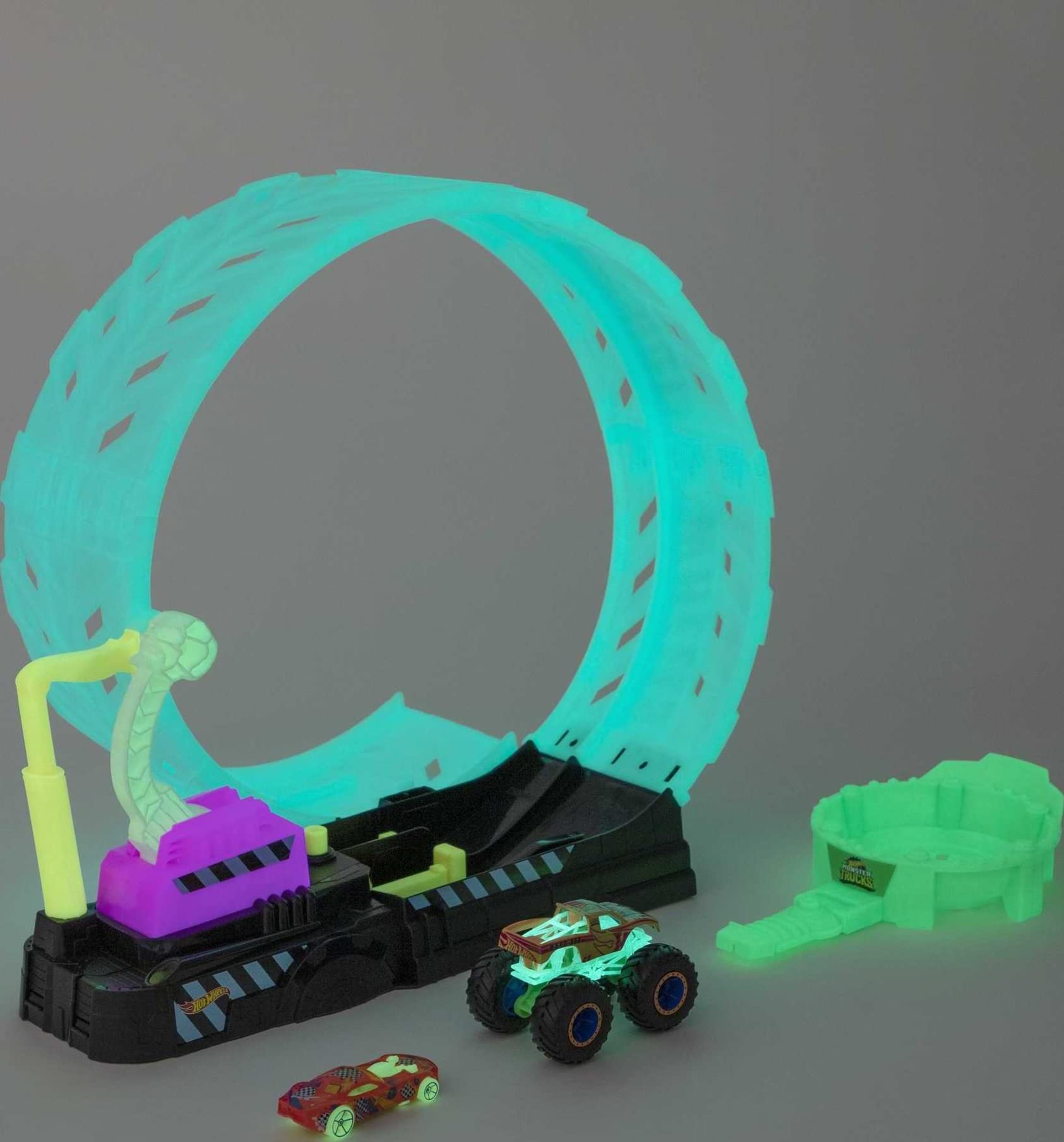 • Turn off the lights and keep on racing with the Hot Wheels Monster Trucks Glow in the Dark Epic Loop Challenge playset with elements -like the GIANT loop -that really glow in the dark.