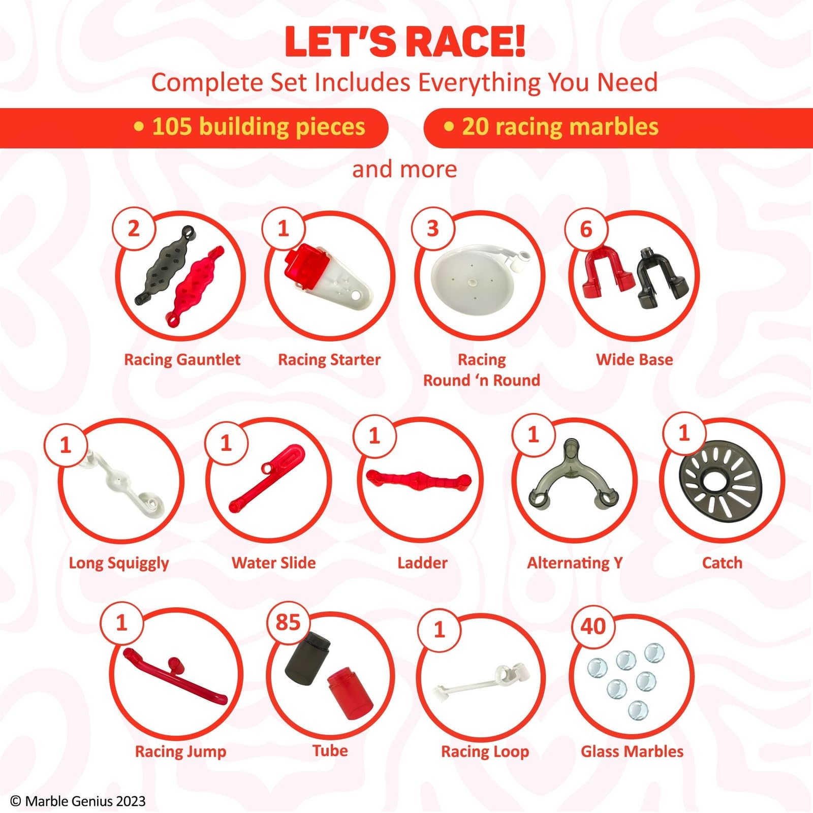 - ENDLESS FUN & CREATIVITY: The 105 racing themed pieces, including many see-through marble run pieces, provide endless possibilities for constructing an exciting race track maze. With a variety of accessories available, such as loops, twists, and turns, you can create an intricate and challenging design for your marbles to navigate. Whether you're a beginner or an experienced marble run enthusiast, these pieces offer endless fun and creativity.