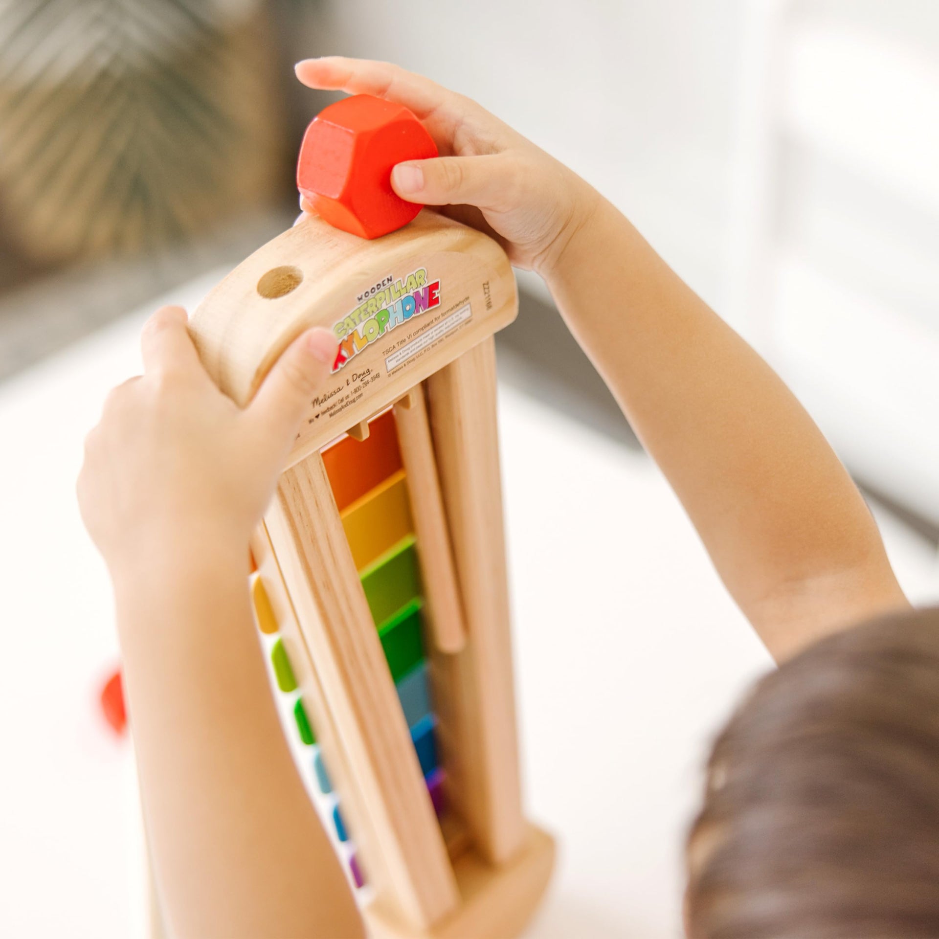 This colorful xylophone is a child's ideal first introduction to music! Mallets in hand, children can explore simple music concepts through creative play, becoming familiar with an octave, intervals, and rhythms. Over time, this little caterpillar will help children develop an appreciation for sound and music! The nifty wooden mallets store neatly in the xylophone itself to look like the caterpillar's antennas.