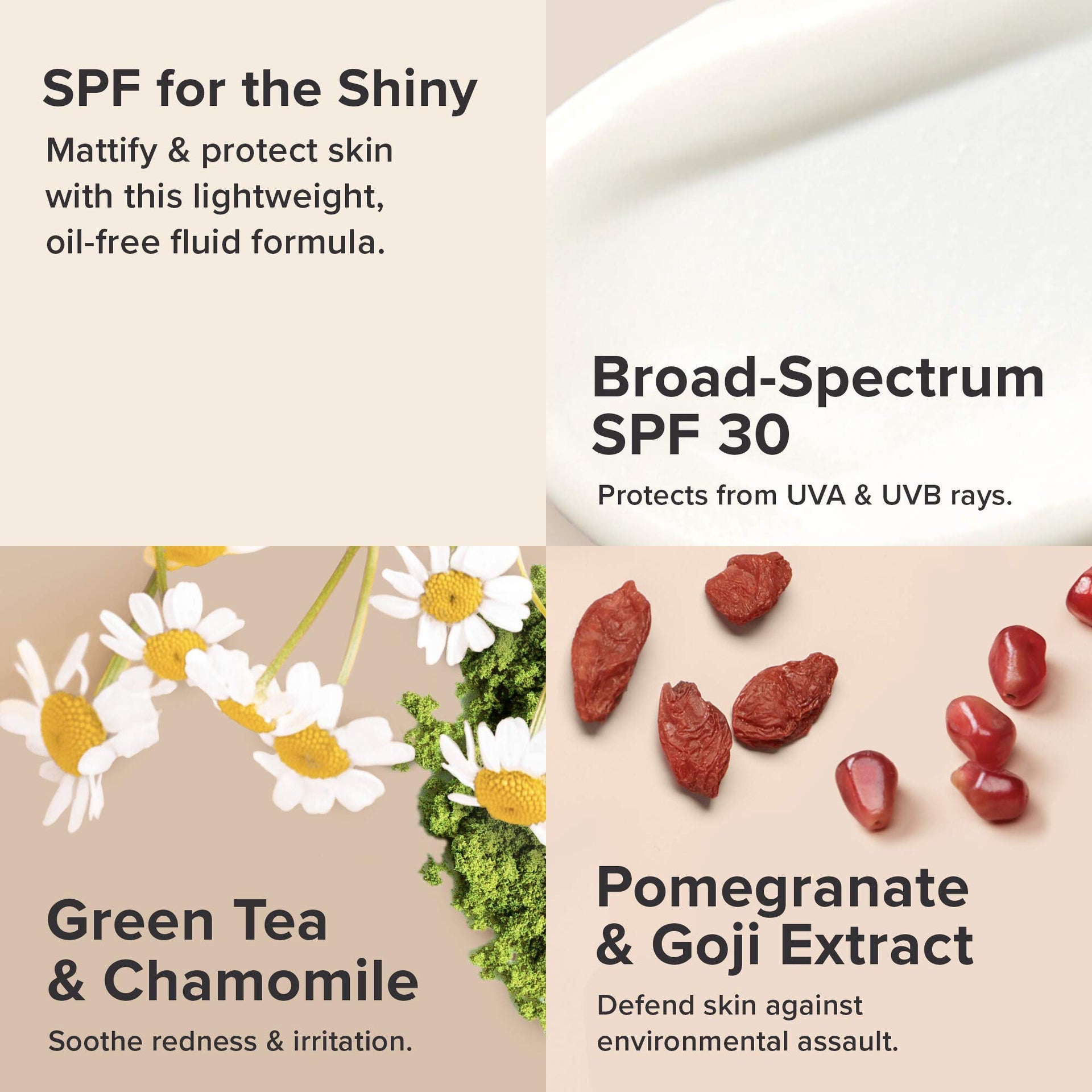 - MATTE-FINISH BROAD SPECTRUM SUNSCREEN: Wave goodbye to greasy sunscreen! Our lightweight, oil-free moisturizer with SPF 30+ protects your skin from UVA & UVB damage while enriching skin with antioxidants to promote a healthy, even-toned look & feel.