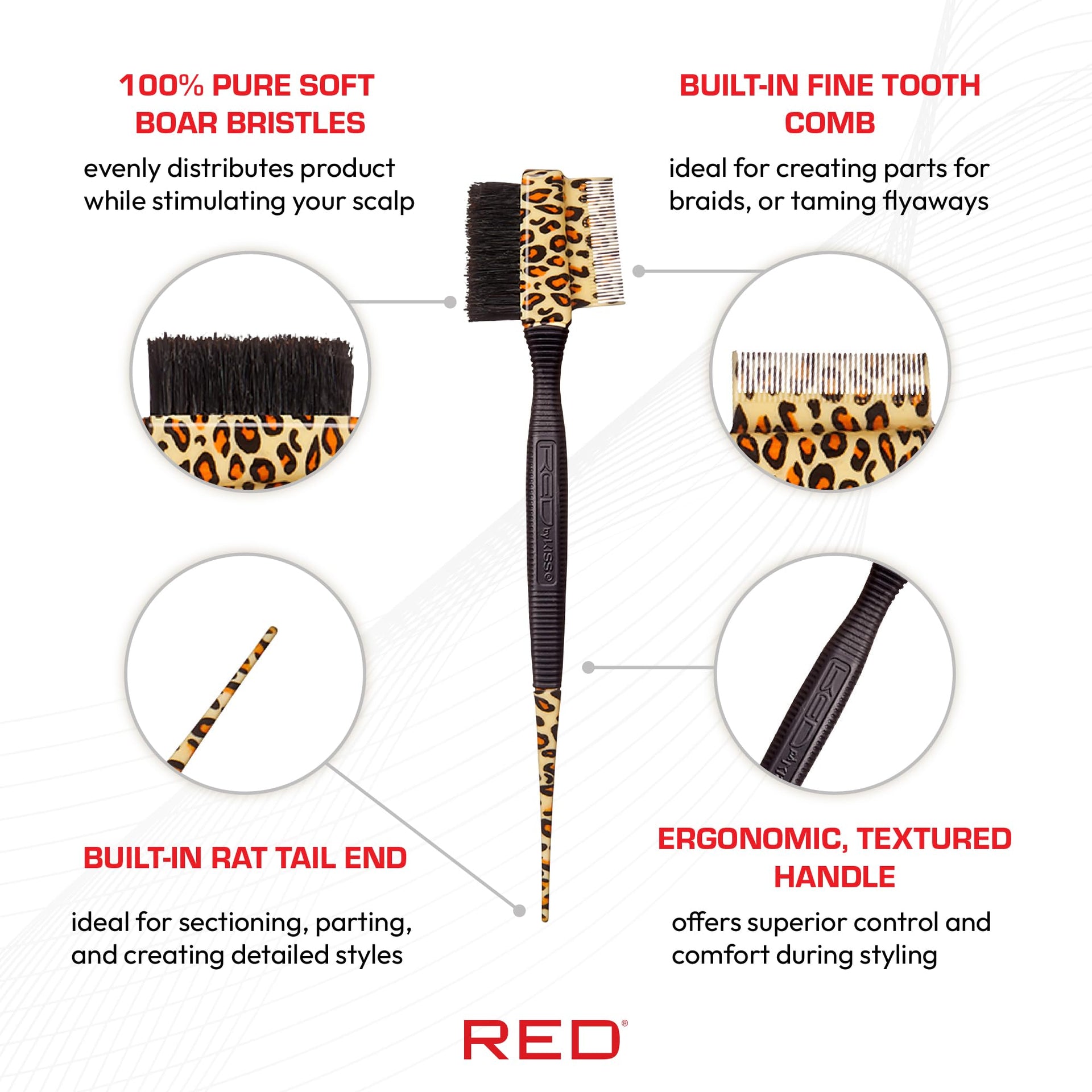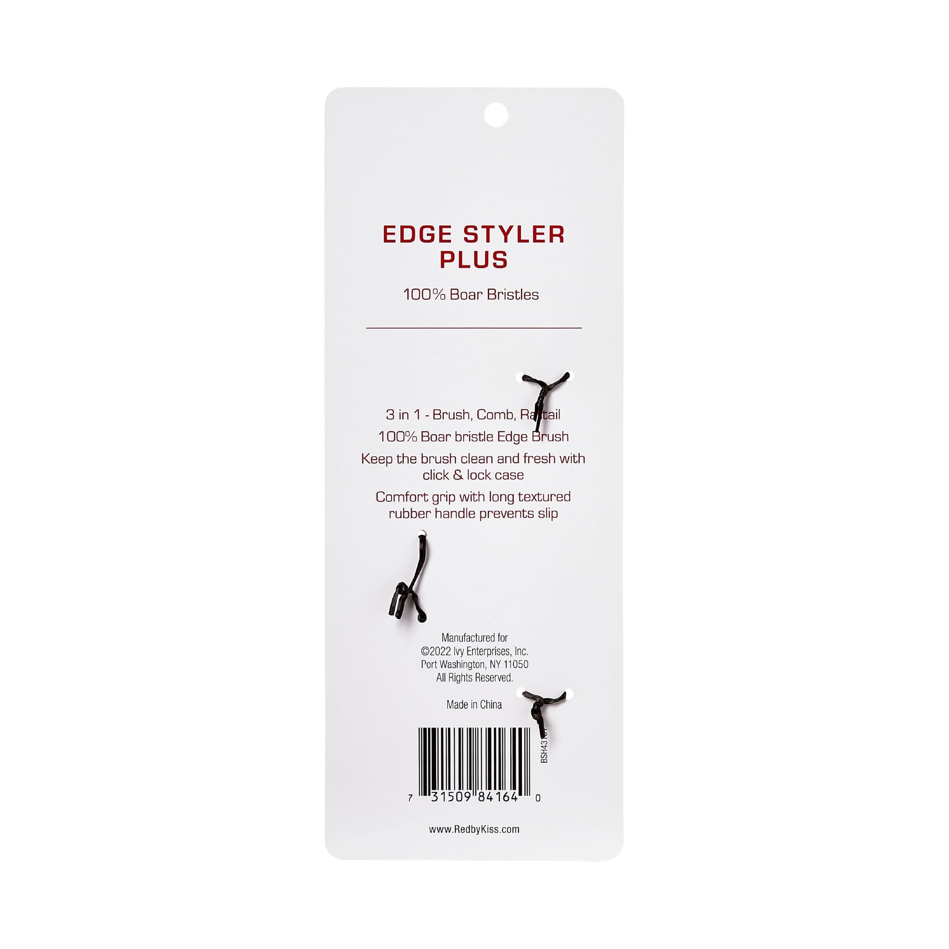 Details: Style your edges like a pro with the Red by Kiss Professional 3-IN-1 Edge Brush, a must-have beauty tool for creating flawless edge styles, clean parts, and sleek finishes. This all-in-one styling solution combines three essentials—a 100% pure boar bristle brush, a fine-tooth comb, and a rat-tail handle—into one compact and easy-to-use tool. Crafted with premium materials and backed by professional design, this brush is tailored for use with the Kiss Edge Fixer Edge Control Gel, helping you apply product smoothly and evenly for long-lasting hold and shine. The boar bristles are soft yet firm, designed to gently lay edges flat while promoting healthy hair growth by stimulating the scalp and evenly distributing natural oils along the hair shaft. Whether you're styling baby hairs, creating parts for braids, or taming flyaways, the fine-tooth comb and rat-tail end provide unmatched precision and control. The textured body ensures a secure, comfortable grip, making it easy to achieve salon-quality results from home. Plus, the included protective case keeps your brush clean and ready for your next styling session—perfect for travel or everyday use. Safe for all hair types, this 3-in-1 edge brush is gentle enough for children’s hair yet effective enough for textured and coily styles. Elevate your edge game with a professional-grade tool that delivers every time.