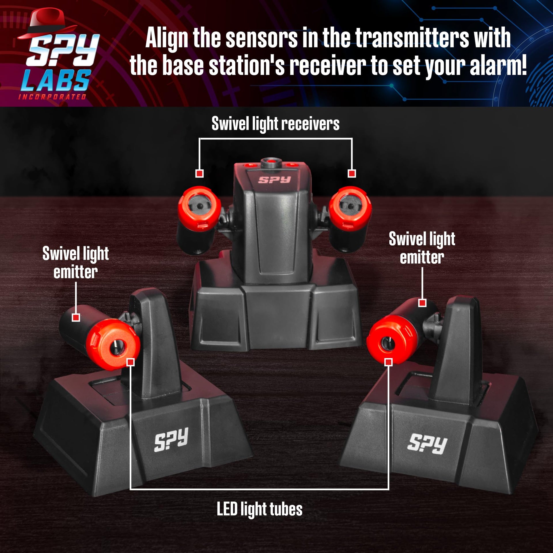 - REALISTIC PRETEND PLAY: This discreet toy security system safeguards your belongings and secrets! Activate the invisible LED light beams in the two transmitters with a push of a button, then align the light beams with the receivers on the base station to create an invisible tripwire. When the barrier is breached or interrupted, the alarm sounds and the interloper is revealed!