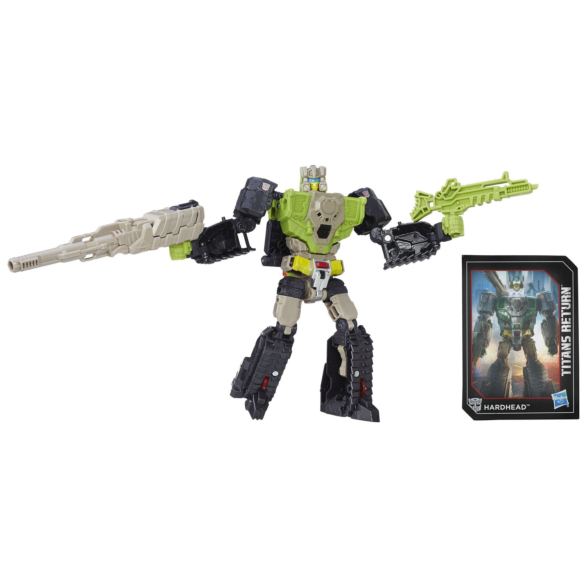 The Transformers battle explodes into uncharted territory when the Titans Return! To control an ancient race of giant, city-sized warriors -- the Titans -- the Autobots and Decepticons must harness the power of Titan Masters, smaller bots that give bigger bots increased abilities in battle. Join the battle with Transformers Generations Titans Return figures. Titan Master Furos might be the only bot who craves battle more than Hardhead. That makes him the perfect partner for the combat-driven Autobot. Just don't get them started on whose fireblast took down that Decepticon. Furos gives Hardhead a regenerative healing power that instantly repairs armor and systems damage in battle. This Titans Return Deluxe Class Autobot Hardhead figure comes with a Titan Master Furos figure. The Furos figure becomes the head of the Hardhead figure. Unite them and power up for battle. Titan Master figures can become the head for Deluxe Class, Voyager Class, or Leader Class Titans Return figures. Unite this Titan Master Furos figure with other bots to create different combinations, or unite other Titan Master figures with this Hardhead figure. Find the best team ups and join the battle. Additional figures are each sold separately. Subject to availability. The Hardhead figure converts from robot to vehicle and back in 12 steps. The Titan Master Furos figure converts from robot to head and back in 1 step. When the Hardhead figure is in vehicle mode, the Furos figure fits inside. Also includes a blaster accessory and a collectible character card with tech specs. Transformers and all related characters are trademarks of Hasbro.