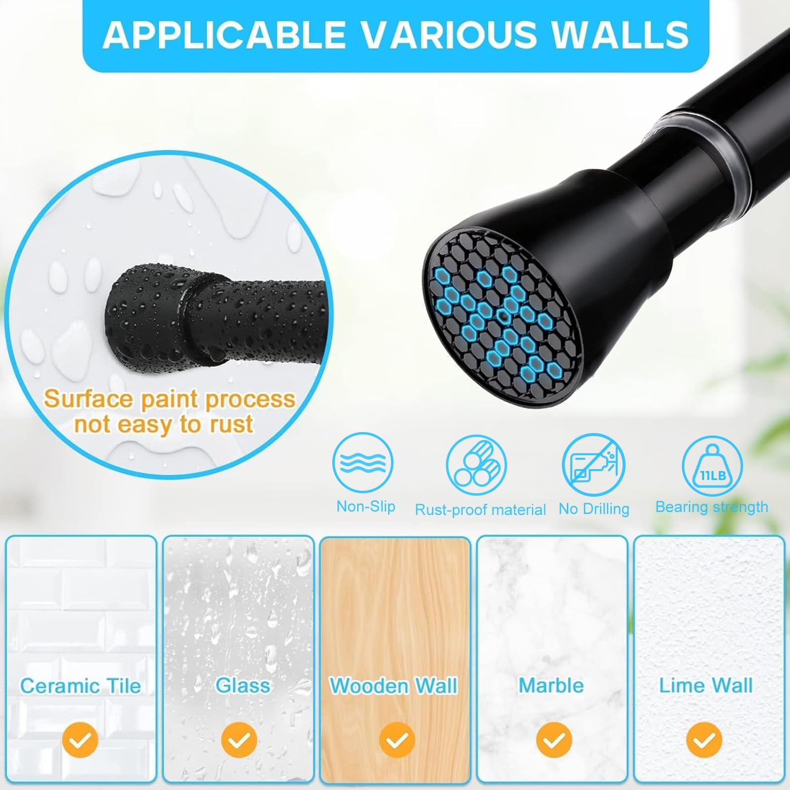 - Black Spring Tension Curtain Rod, 28-52 in Adjustable No-Drill Rod, 7/8" Diameter, Heavy Duty Anti-Slip for Shower, Windows, Kitchen & Closet
