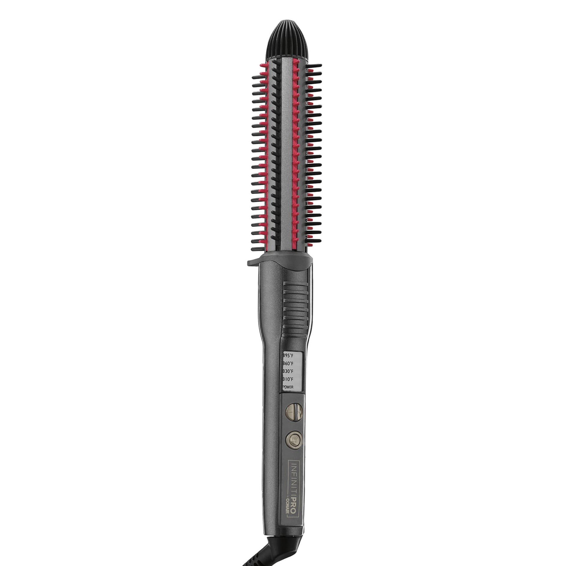 Features Nano technology eliminates hot spots and reduces static for healthy-looking hair Extra-smooth tourmaline ceramic surface for superior performance Ionic Fusion technology reduces frizz for brilliant shine 395°F highest heat setting for long-lasting curls and waves 30-second heat-up Uniform heat recovery system maintains ultra-high heat levels 100% styling control, new button design prevents accidental shut-off 5 precision LED temperature settings with Auto-off Red bristles heat up, black bristles stay cool Extra-long professional-length cord