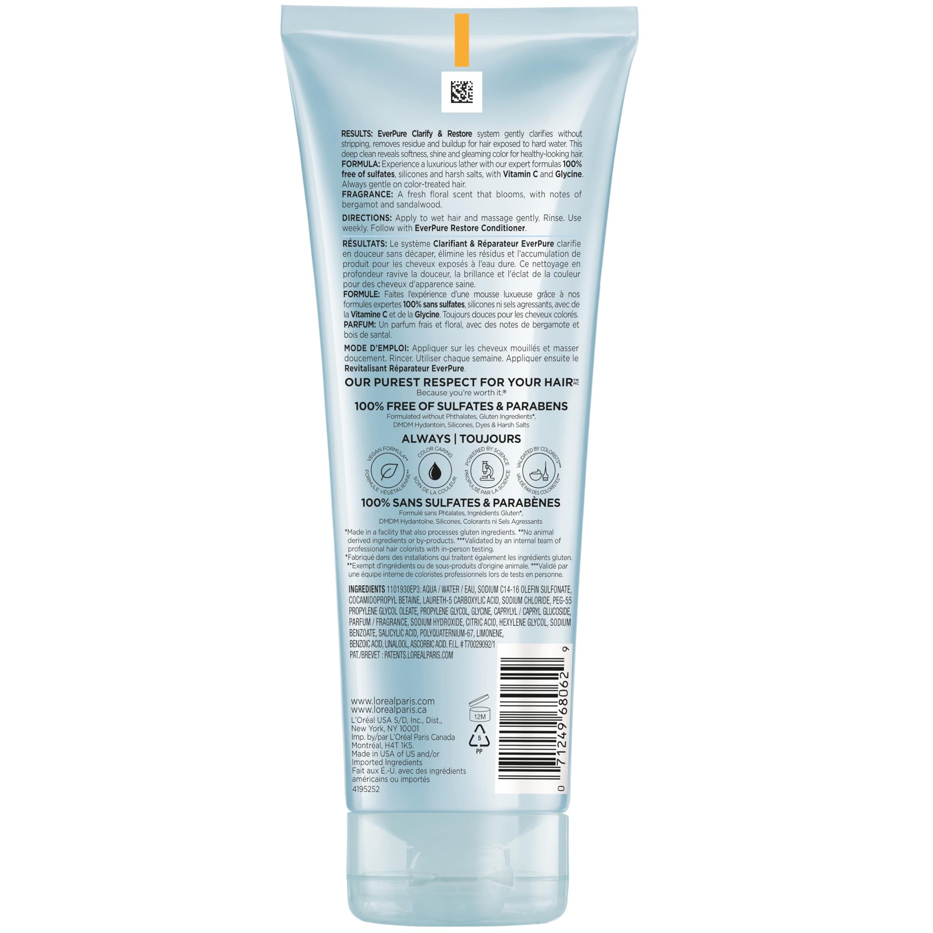 Details: Get a hair detox without compromising your color! EverPure Anti-fade Clarifying Shampoo and Restoring Conditioner features non-stripping, dual action technology, with Antioxidants Vitamin C and Glycine, to remove unwanted hair residue and styling build-up while delivering 2x moisture* vs non conditioning shampoo. For salon results at home, apply EverPure Clarify Shampoo to wet hair and massage gently. Rinse. Follow with EverPure Restore Conditioner. Apply to wet hair and massage gently. Leave on for 1-2 minutes. Rinse. Use weekly. For your brightest and strongest hair color, alternate between EverPure Sulfate free Clarify Shampoo and Conditioner regimen and the EverPure Sulfate Free Bond Repair Shampoo and Conditioner on wash days. EverPure hair products have been formulated without sulfates, parabens, DMDM hydantoin, added phthalates, dyes, and gluten ingredients. Always vegan, color-caring, and powered by science. *Vegan, No animal derived ingredients or by-products, **Gluten Free, made in a facility that also processes gluten.