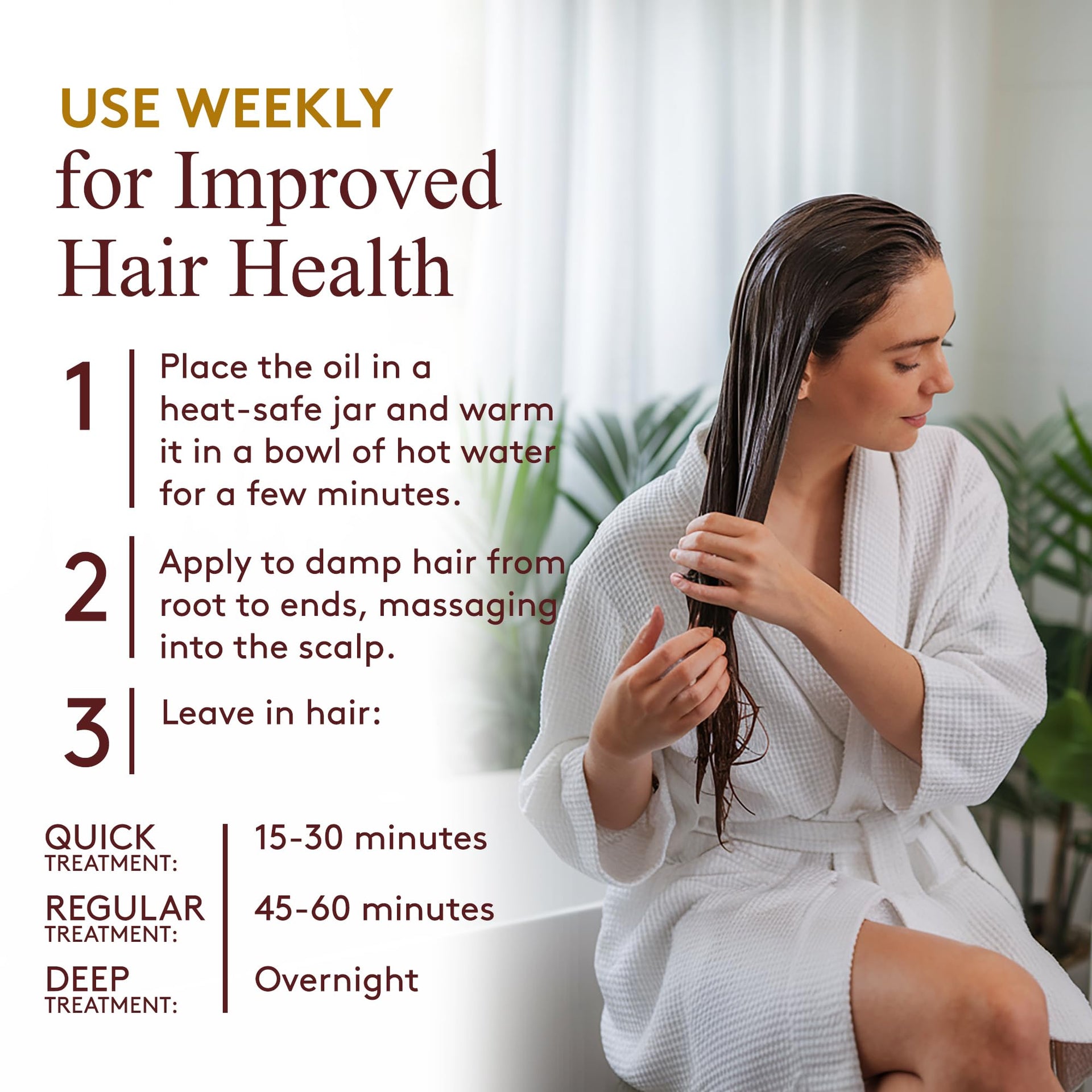 • Easy to Use - Warm oil in a heat-safe jar, apply to damp hair from root to ends, massage into scalp, and cover. Leave on for 15-30 min (quick), 45-60 min (regular), or overnight (deep conditioning)