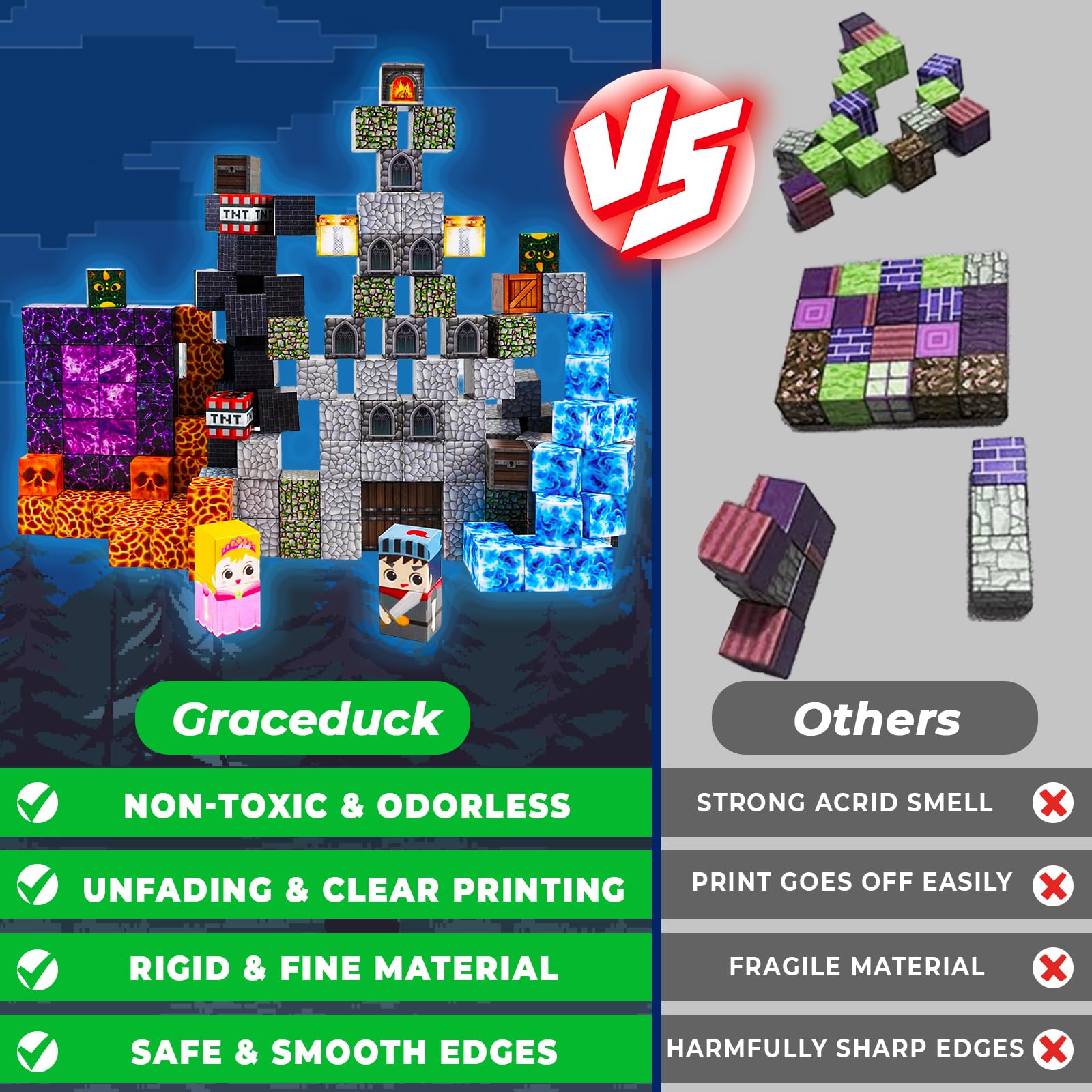 - 【Dark Castle Sword Domain Magnetic Cube Kit】Including 150 Magnetic cubes in 18 colors. Idea booklet with the storyline and beautiful patterns, keep them busy in clever ways. GraceDuck magnetic activity cubes are made of high-quality ABS material and crafted with round edges and the right size. Unlike other Magnetic toys on the market, our magnetic cubes kit with super strong internal Magnetic, which is easier for toddlers ages 3+ to stick the cubes together and make builds sturdy. Perfect STEM toys help kids gain a deeper understanding of the structure and learn about magnetic properties!