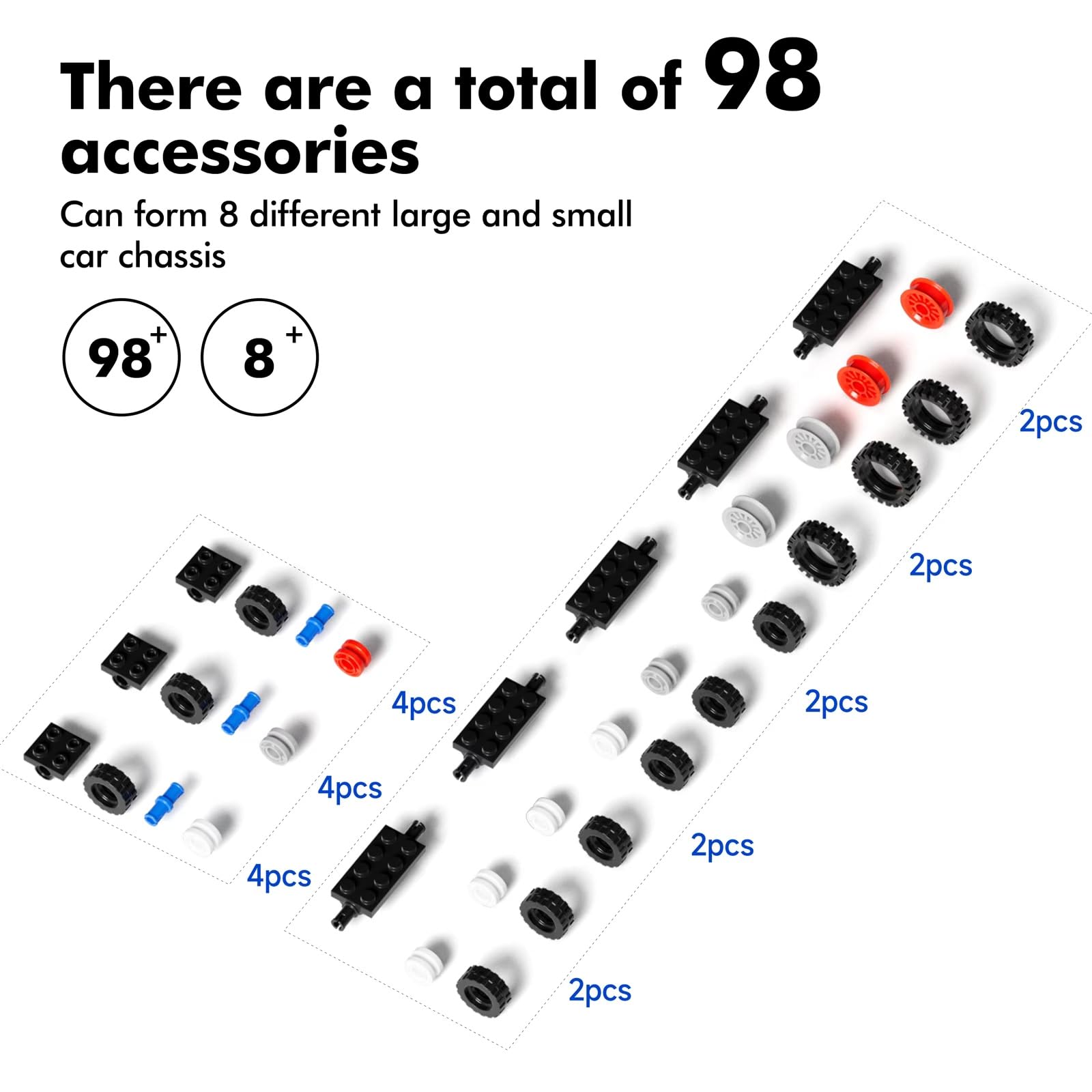 - 【Content included】98 parts, 7 different styles, can be assembled into 8 sets of building block car chassis