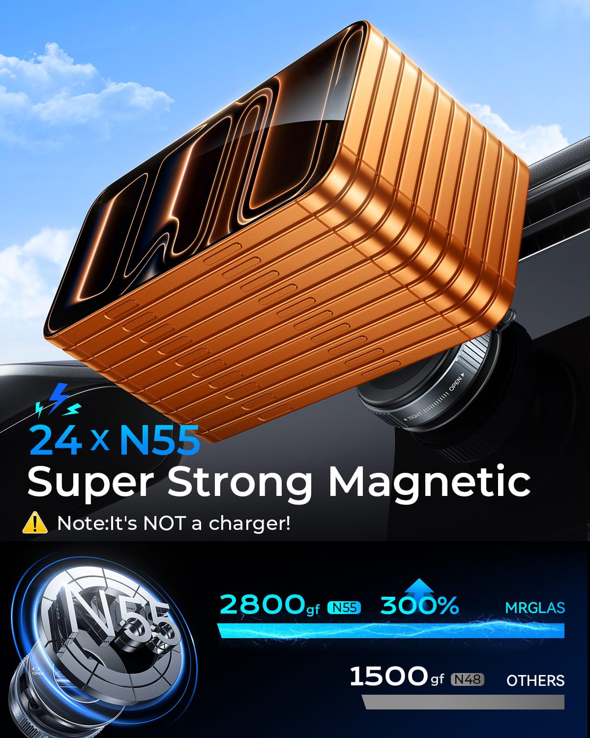 • [Supercharged Magnetic Force for Ultimate Stability]: Equipped with 24 high-performance N55 magnets, this phone mount boasts magnetic strength 240% stronger than standard magnets, providing up to 2800gf of magnetic force. It can securely hold devices as heavy as the iPhone 16 Pro Max. After passing 6,000 vibration tests and extreme road simulations, you can count on your phone to stay firmly attached, even in challenging conditions. The precise magnetic design ensures strong adhesion without interfering with phone signals, giving you uninterrupted navigation and clear calls