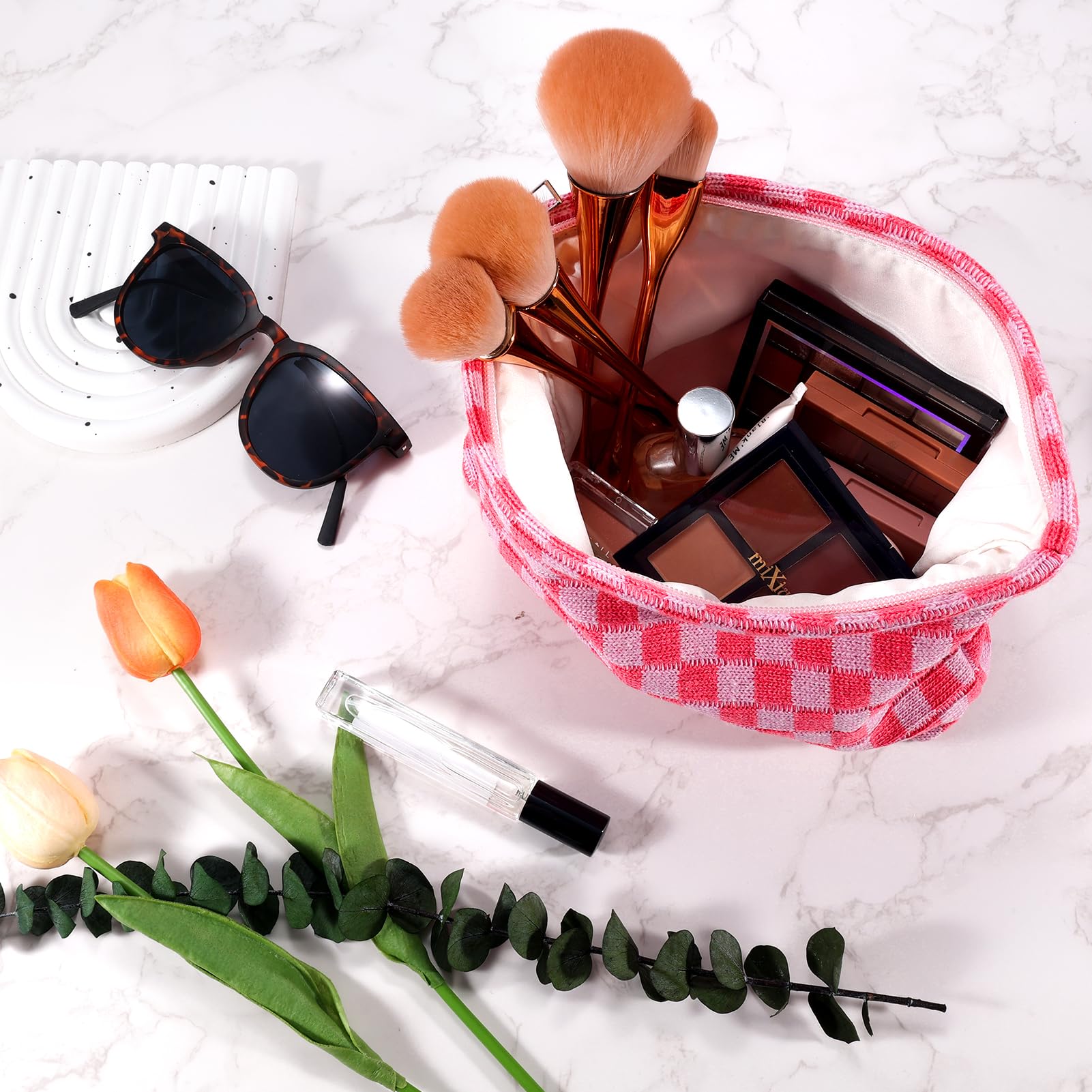 - LARGE CAPACITY AND PREMIUM MATERIAL: The cute makeup bag measure 10.6×7 inches and 7×4 inches, easy to carry. The checkered makeup bag is made of soft knitted fabric, easy to clean. The smaller ones can be used as pencil case or pencil pouch. This makeup travel bag can also hold small items such as makeup, skincare products, lipstick, eye shadow, eyebrow brush, etc. Makeup storage bag for women toiletries