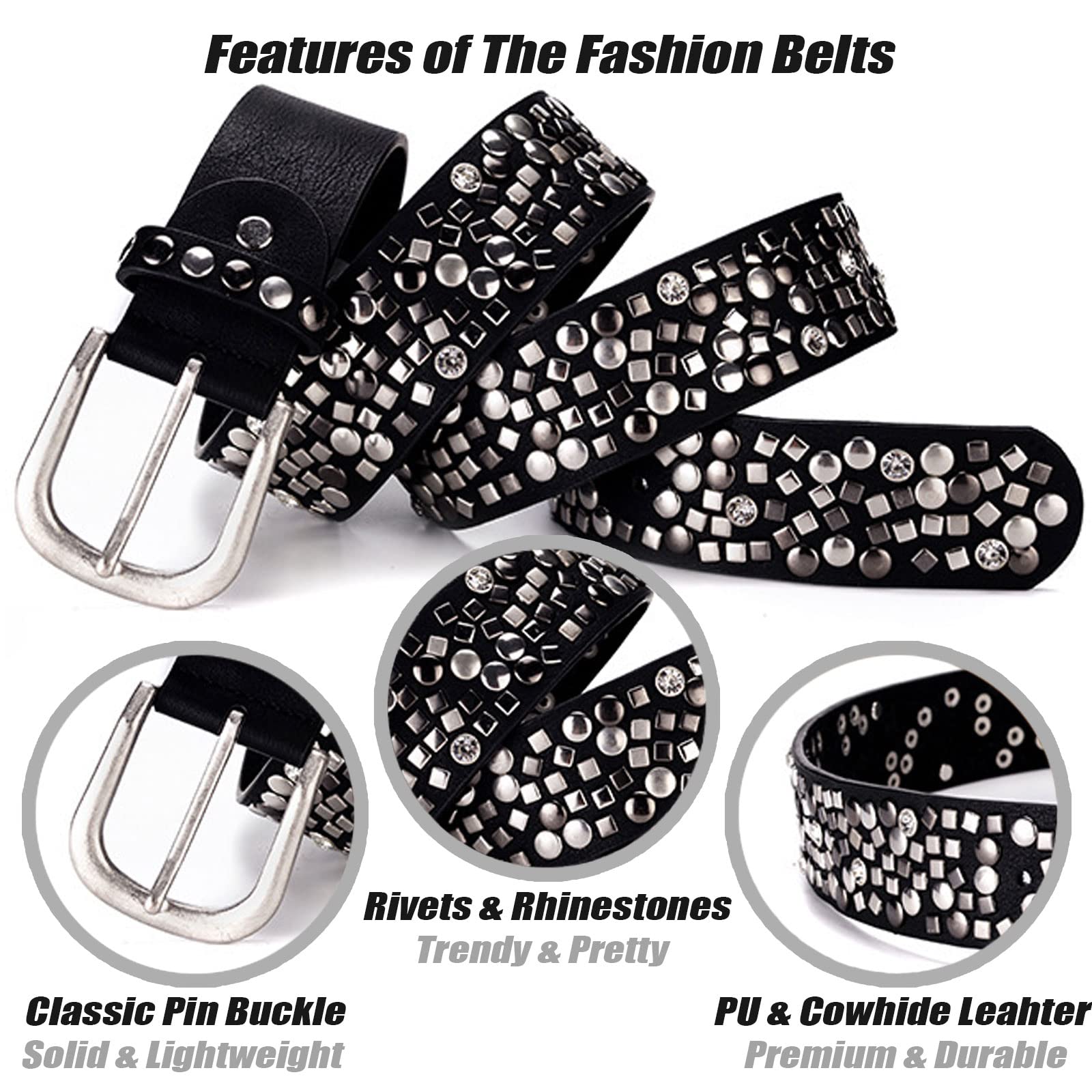 • 💕【Material】These trendy belts are made of a mix of PU leather and cowhide, which is both soft and durable. The rivets and rhinestones are studed and will not fall off easily.