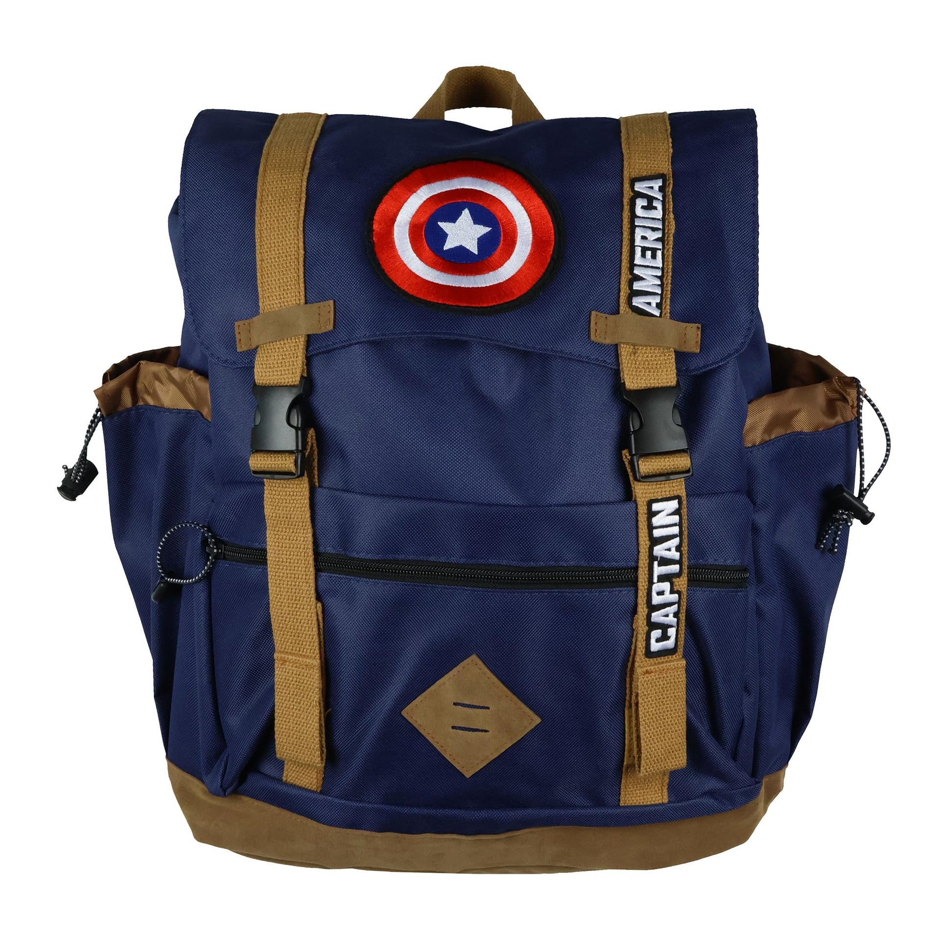 If you're a fan of Captain America or just need a reliable everyday bag, this flap-top backpack checks a lot of boxes. It’s got that bold embroidered shield right on the fold-over flap, and the buckle straps help keep everything secure when you're on the move. The main compartment is roomy and cinches shut with a cord closure, so loading and unloading is easy. There’s even a padded sleeve inside to keep your laptop or tablet safe. On the outside, you’ve got a zip pocket up front for smaller items-stuff like earbuds, snacks, or whatever you want to grab quickly. There are two side pockets too, with drawstrings to keep your water bottle or charger from falling out. The padded shoulder straps make it really comfortable to wear, and the top handle gives you another easy way to grab and go. It’s a solid everyday bag with just the right amount of superhero style.