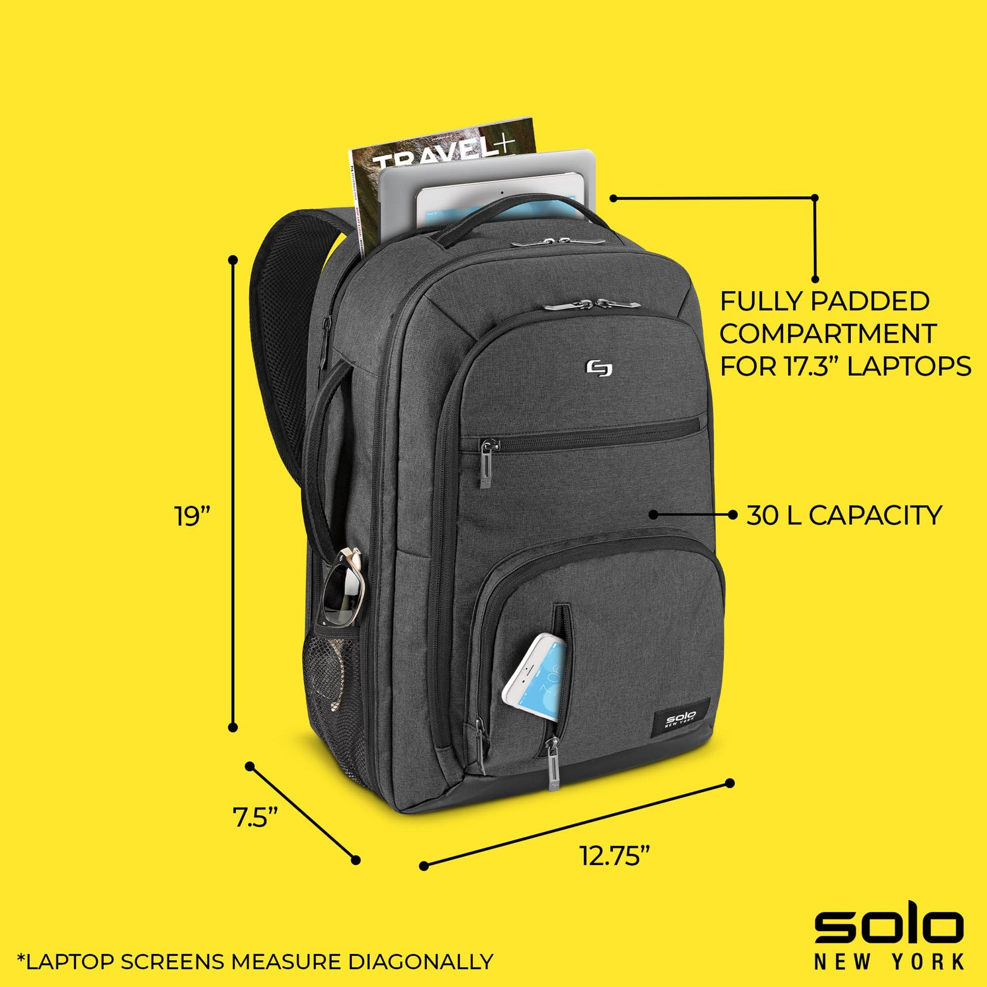 - Solo New York TSA Laptop Backpack for Women & Men -Carry On Bookbag for Travel & Work, Lightweight Bag, Mesh Side Pockets, Padded Straps, Fits 17.3" C