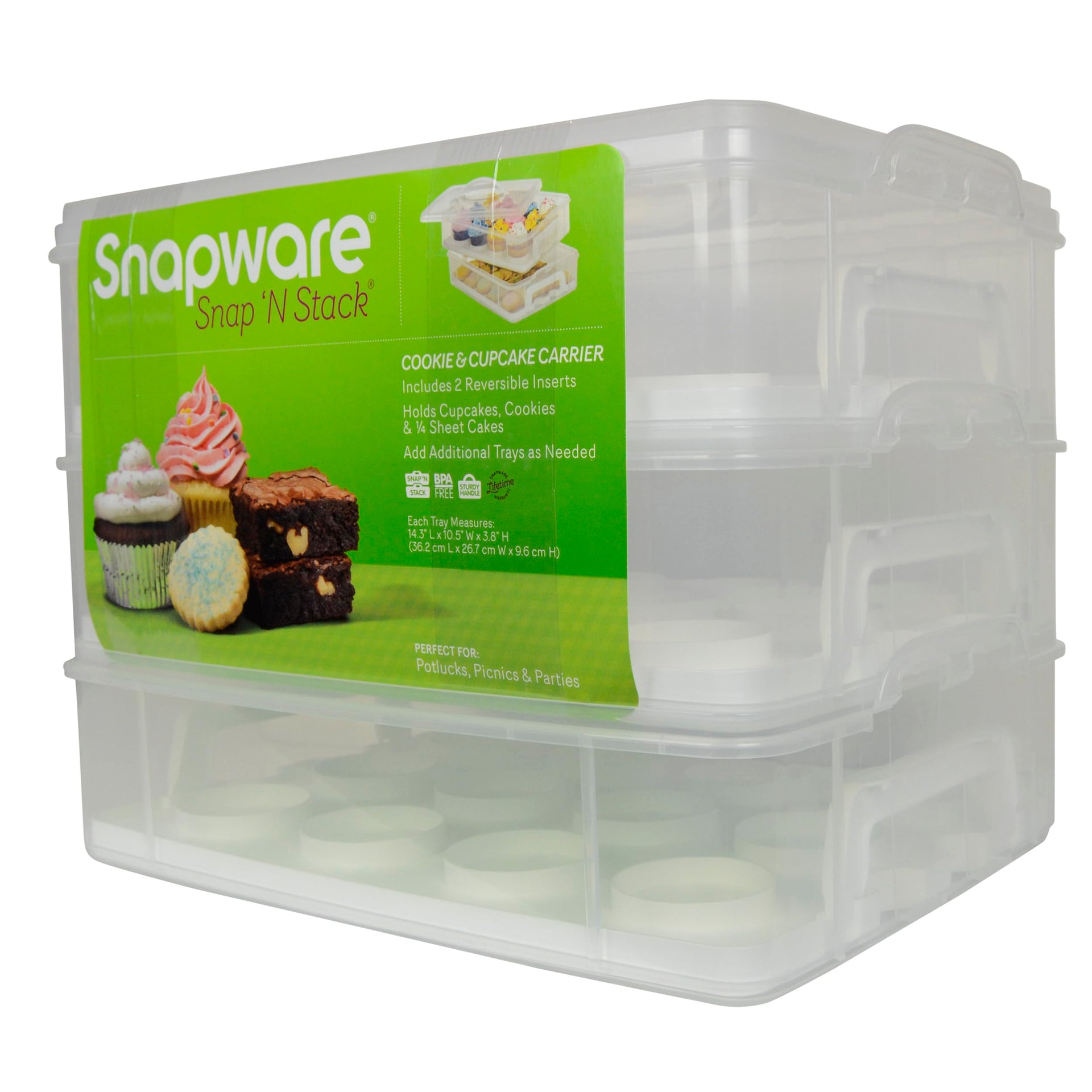 • SWEET CARRYING: The Snapware Snap 'N Stack 2-layer carrier is perfect for transporting all manner of sweets with safety. Two cupcake holders can hold up to 24 cupcakes or cookies, and the stackable trays keep food items separate and organized..Special feature : Alcohol-Free