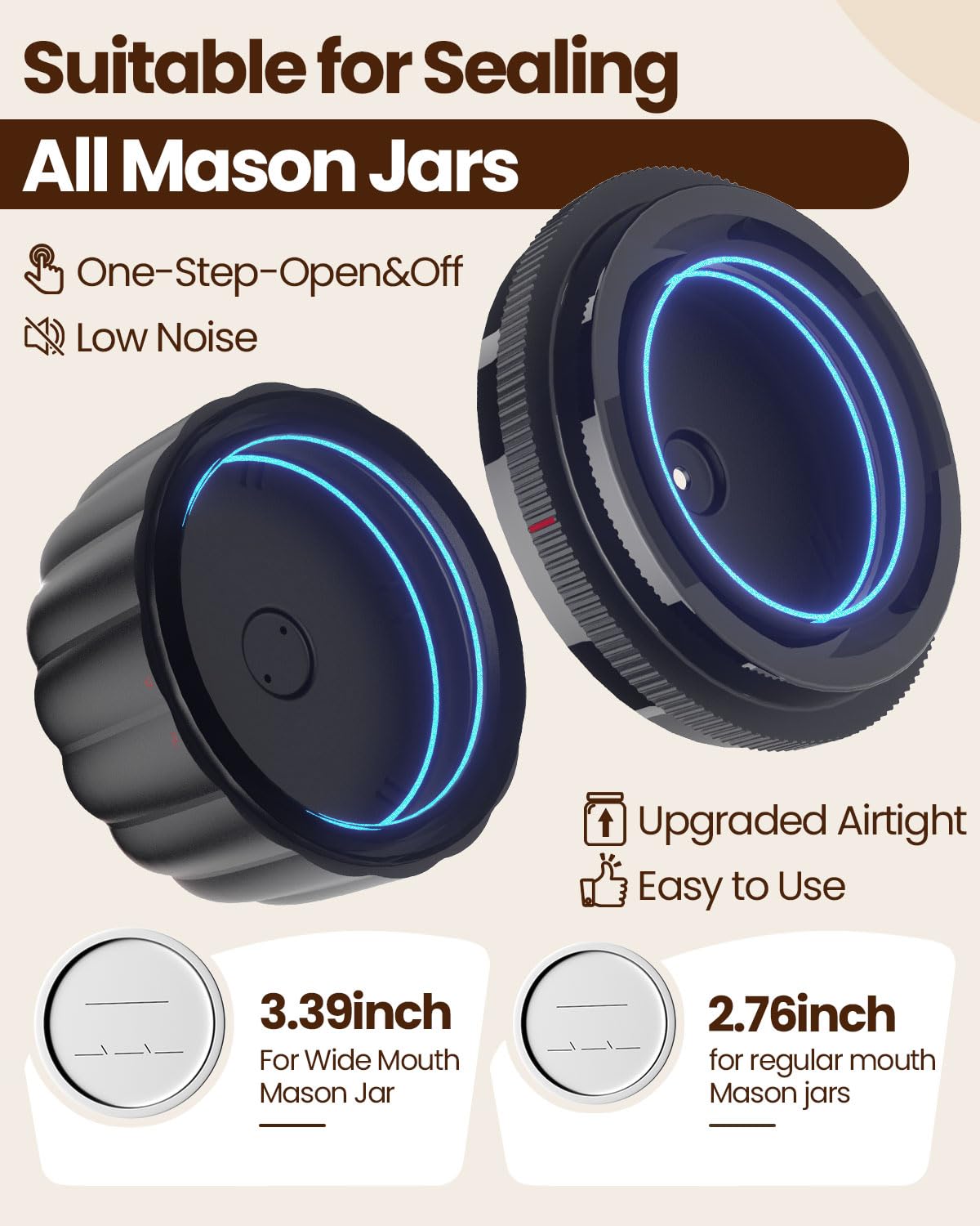 Universal 2-in-1 Compatibility:Versatility meets convenience with our innovative integrated design. Whether you are storing jams in standard-mouth (2.76") jars or bulk dry goods in wide-mouth (3.39") containers, the Snuuoby adapts instantly. With a simple rotation of the bottom mechanism, you can switch between sizes effortlessly-no extra attachments to lose, just one sleek tool that does it all.
