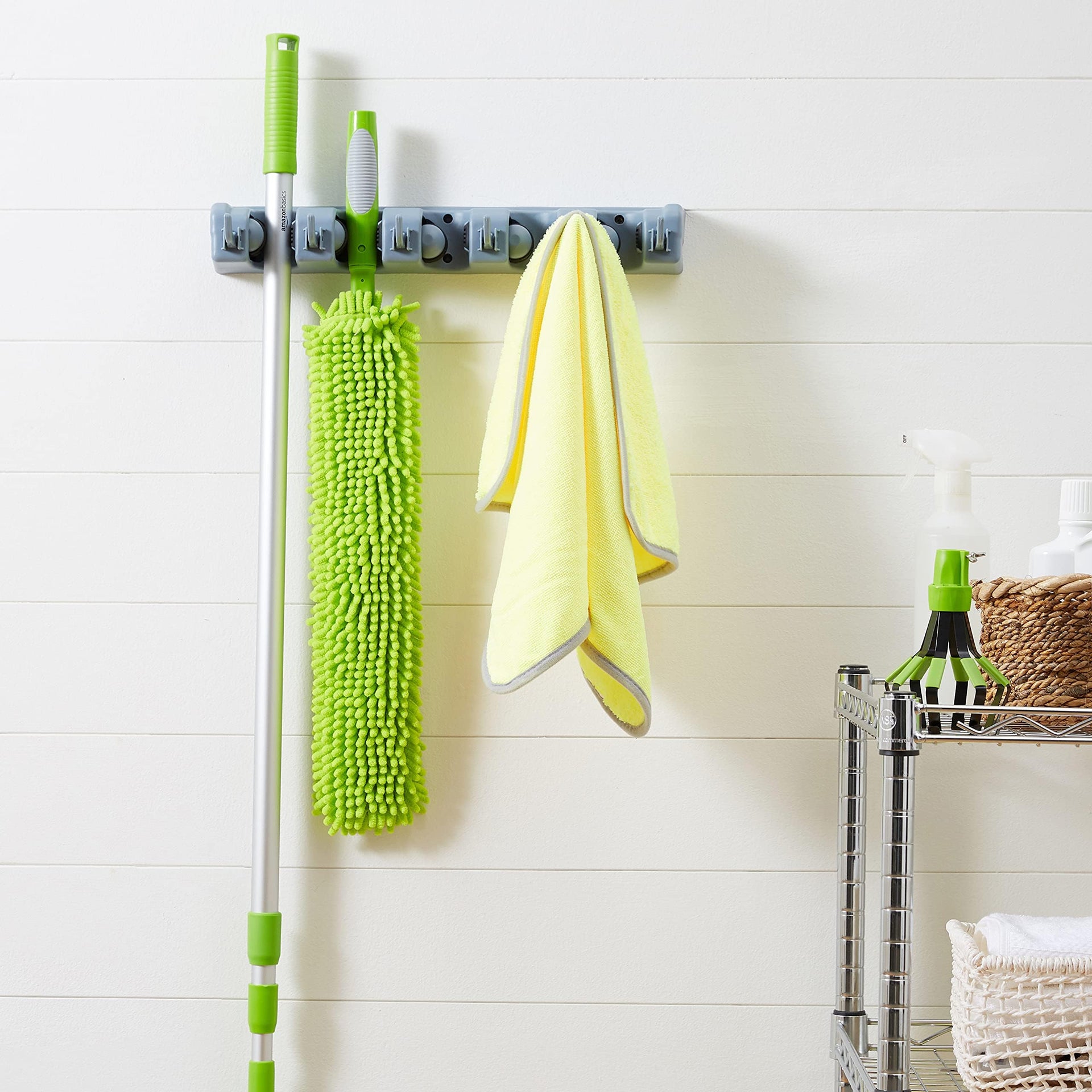 - Amazon Basics Wall-Mount Broom & Mop Holder – Heavy-Duty Storage Organizer with Hooks & Slots for Home, Garage, Garden, Laundry, Gray