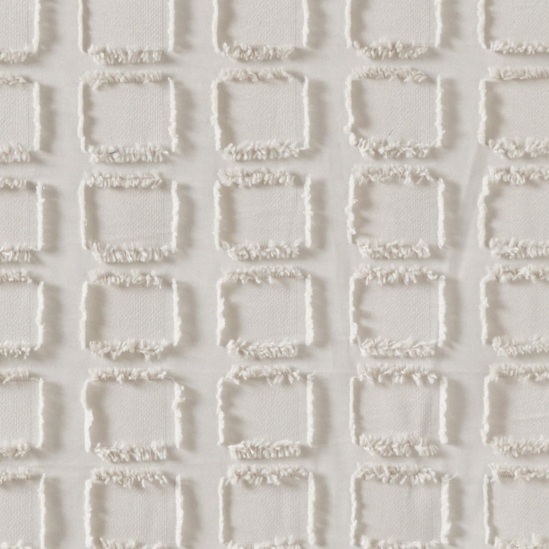 • This solid white shower curtain features a woven square geometric design with a clipped treatment to create beautiful texture and dimension.