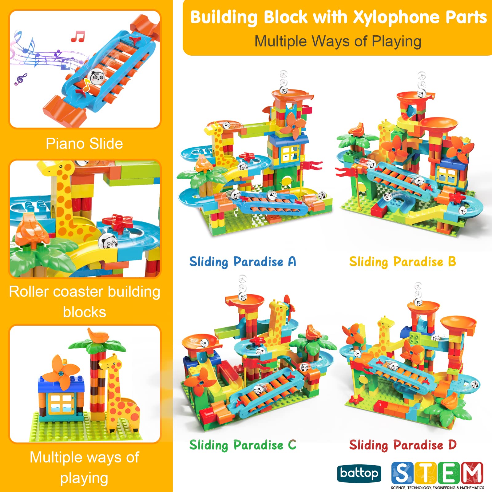 - 【Upgrade Marble Run——Sliding Paradise】: 167PCS fun pieces of xylophone and giraffe track blocks set, unlock a hundred new ways to play that kids can create various imaginative masterpieces, make playtime more fun and focused. The detailed instructions will guide kids to build blocks independently.