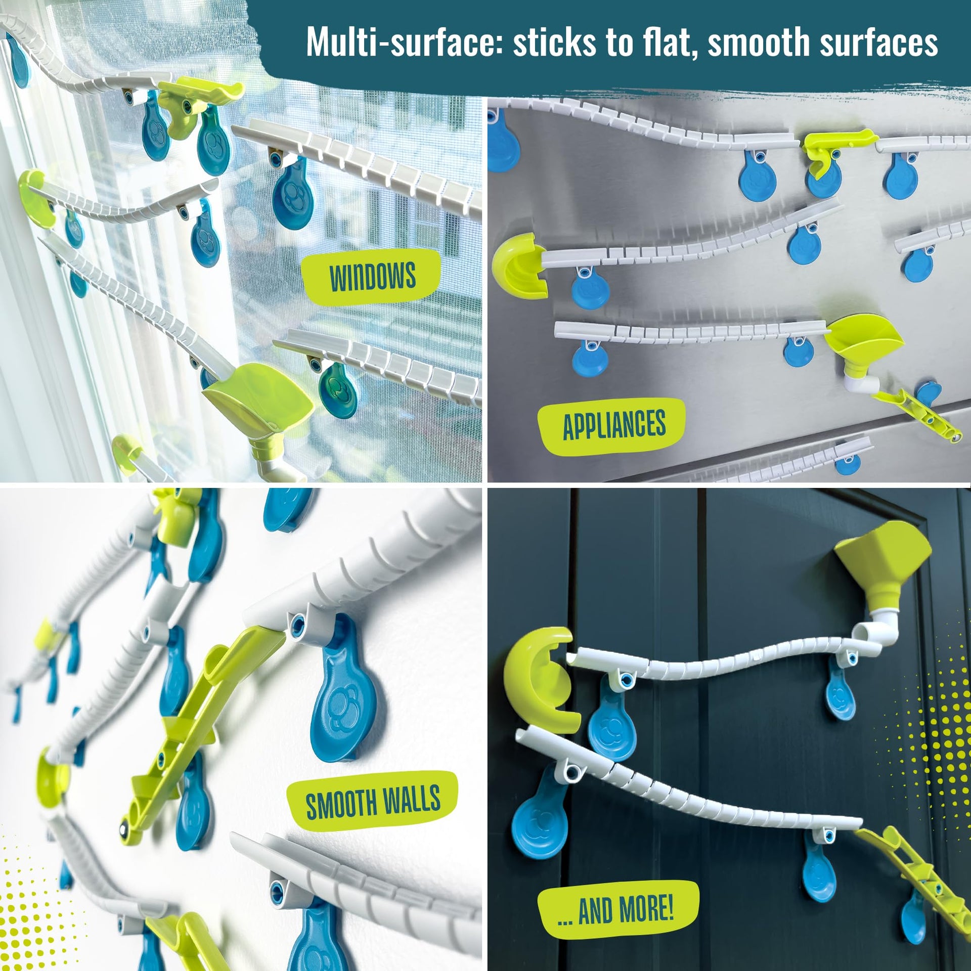 - Intuitive & Mess-free: Tracks attach to smooth surfaces with the help of clever nano-adhesive pads that create a strong but temporary bond; the pads are not glue-based and can be quickly and easily repositioned without leaving behind damage or sticky residue.
