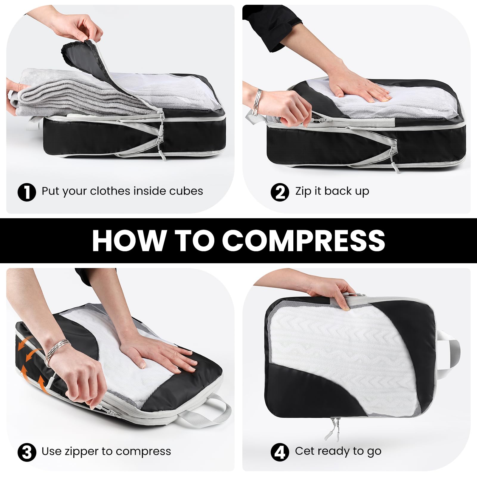 10 Set Compression Packing Cubes – Lightweight, Stretchable Travel Storage Bags for Luggage & Accessories, 10 Pcs, Black