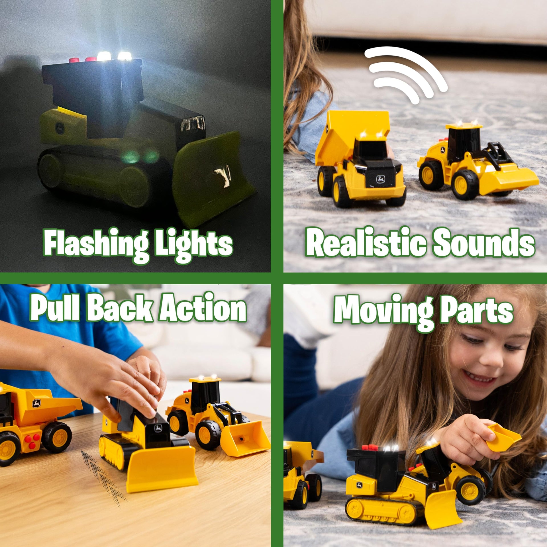 Adventure awaits with the John Deere Mini Construction Vehicles! This set includes three iconic construction vehicles: bulldozer, front loader, and dump truck. These compact construction toys bring big adventures to little hands, complete with authentic John Deere branding and durable construction for hours of rugged play. Each vehicle features bright flashing LED lights and realistic construction sounds activated by the push of a button. With pull-back rev motor action, kids can race them across the floor for endless fun. Just pull back, release, and watch them roll! Built from sturdy materials, these mini trucks are approximately 5 inches long, making them the perfect size for on the go play. Encourage creativity and storytelling as kids take on pretend construction site challenges, building problem-solving skills along the way. Whether digging, hauling, or clearing the way, these vehicles are sure to get your little one’s imagination building!