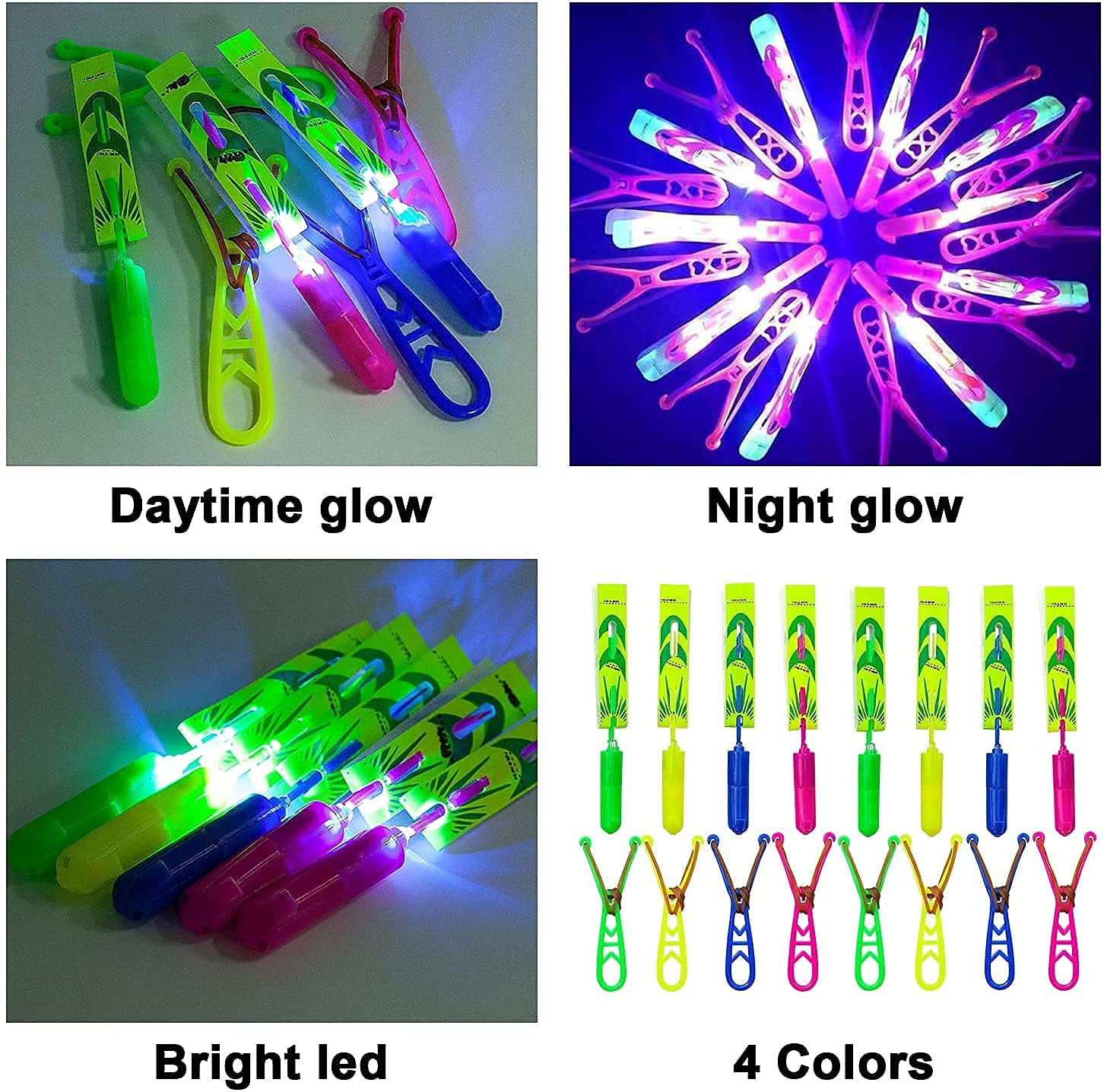 Light up the night with the incredible new rocket copters! The amazing light up helicopters can be fired up to 120 feet in the air from the included slingshots to dazzle during the day, or light up the night with their brilliant motions. Just hook and launch, it's fun for kids of all ages. Ages 8+.