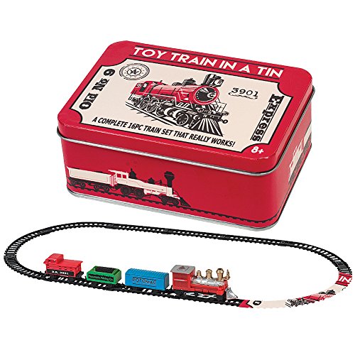Train in A Tin: This set proves that a lot of fun can fit in a little space-this 16 piece train set fits neatly inside its small tin! This battery operated train works like a charm, and is easy to take in and out of the tin. Perfect for travel and for train lovers. Recommended for ages 8 and up.A 16 piece train set that fits neatly in the small tin!Battery operated train really worksRecommended for ages 8 and up.