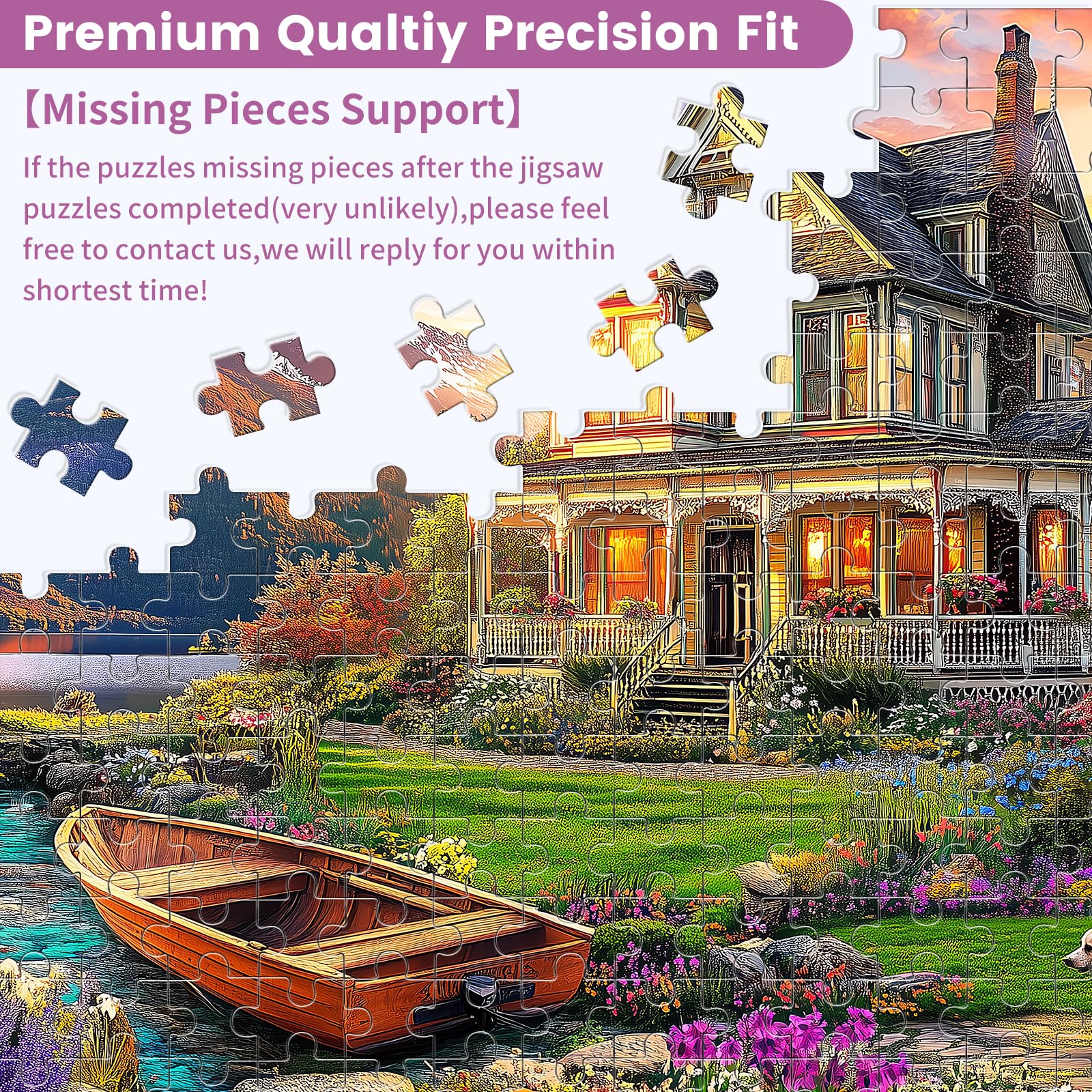 - [Fall Landscape Jigsaw Puzzle]: This jigsaw puzzle shows a villa with a backdrop of mountains and water glistening in the sunlight. The blooming flowers and dogs around add life to the picture, put the puzzle together and enjoy a relaxing time
