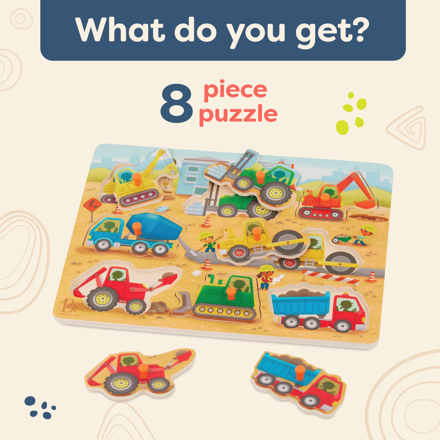 - 8 TRUCK PIECES: This puzzle comes with 8 easy-to-hold pieces that feature different types of construction trucks such as a bulldozer, cement mixer, excavator, and more.