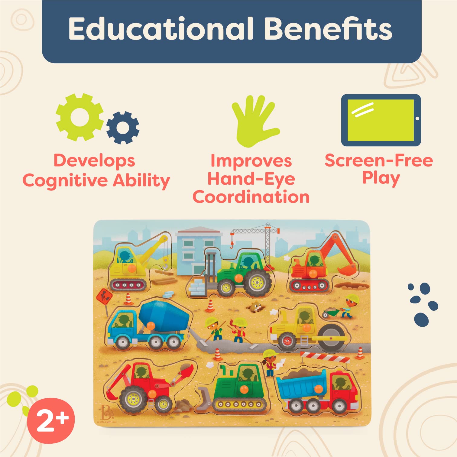 - WOODEN PEG PUZZLE: Explore, match, and play the days away with a colorful peg puzzle inspired by the world of construction!