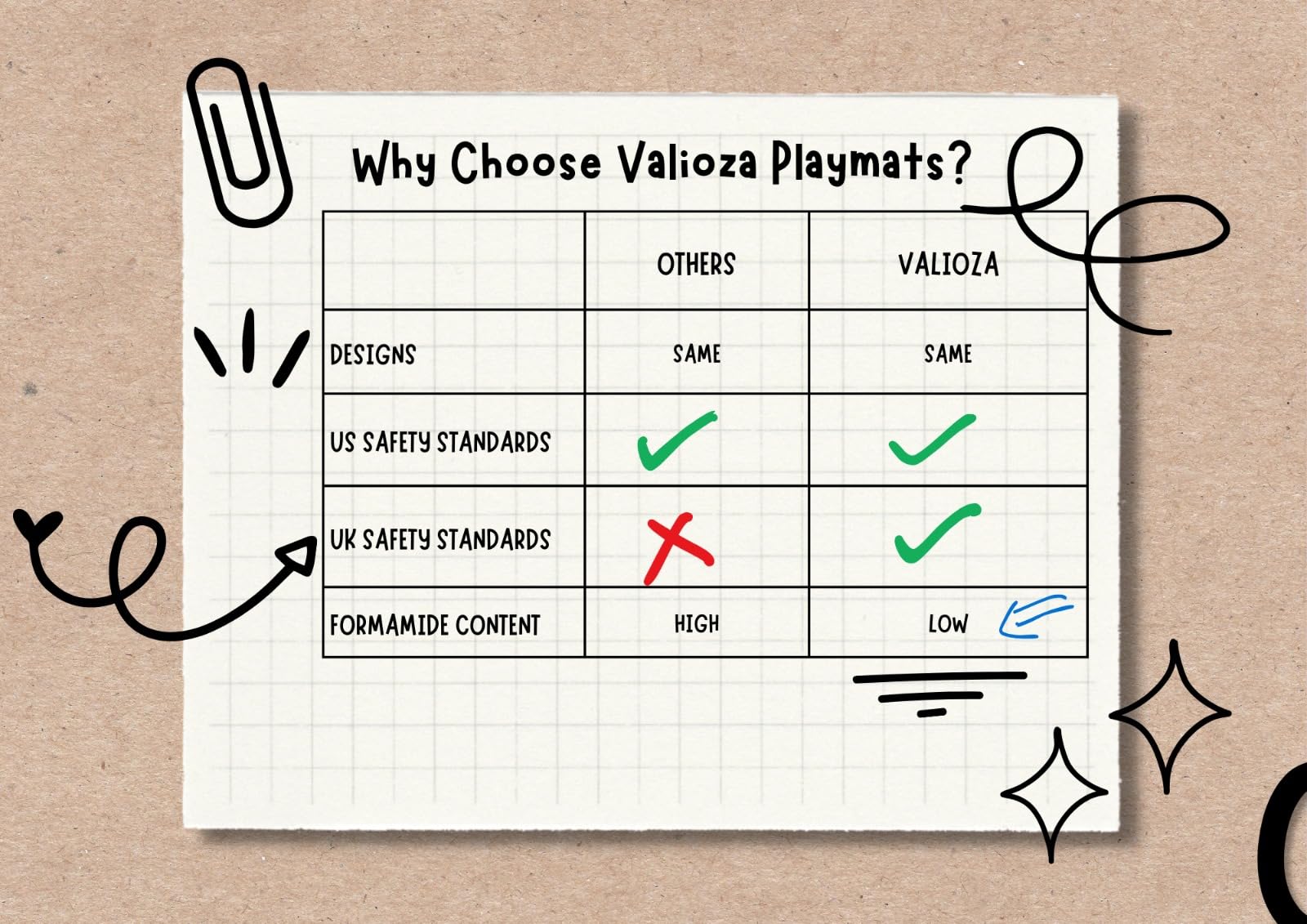 - Safety First: Valioza Play Mats are exceptional quality playmats, safe for the baby and safe for the environment. They are non-toxic, free of heavy metals, phthalate, formaldehyde & BPA. You can relax! We have taken care of the bad stuff 😊