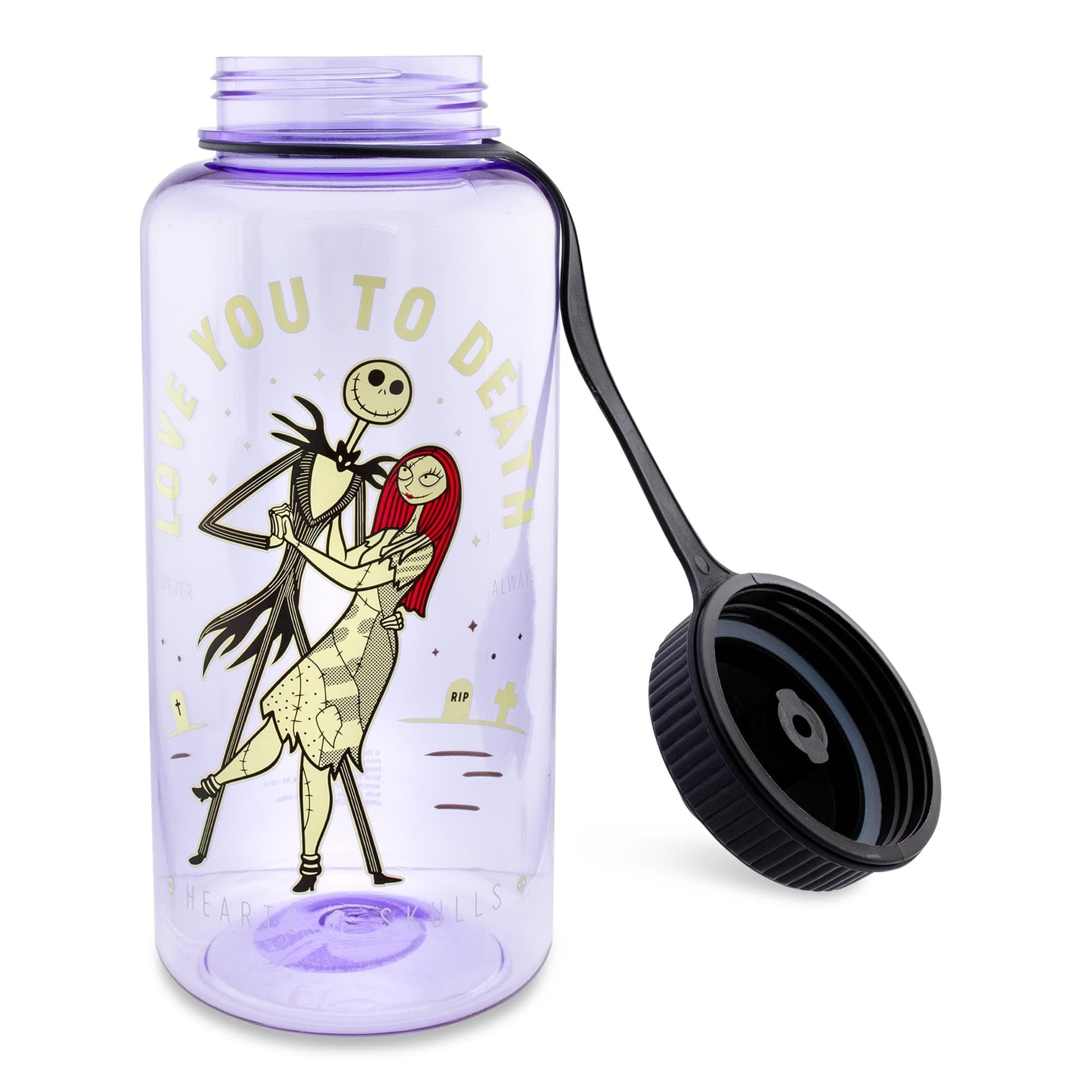 REFRESH YOUR THIRST FOR TIMELESS ROMANCE Halloween Town's cutest undead couple is keeping things fresh with this exclusive water bottle from Tim Burton's The Nightmare Before Christmas. Whether it's Christmas or Halloween, you'll enjoy sipping from this water jug all season long. Jack and Sally are depicted dancing amidst a backdrop of gravestones on this water jug, which appropriately features the phrase "Love You To Death" above and "Hearts & Skulls" on the bottom. SPOOKY DRINKWARE FOR ON THE GO From the scenic moonlit peak of Spiral Hill to your haunted home, you'll experience frightfully fun sips with this durable plastic water bottle. Designed to fill your ventures with a sense of spooktacular delight with every sip. Enjoy all the thrills of true love without the spills of heartache thanks to the screw-top lid featuring a sports cap that keeps your liquid potions securely contained. Take your love for Tim Burton's The Nightmare Before Christmas wherever you go with this officially licensed drinkware. CARE INSTRUCTIONS Hand-wash only Not dishwasher safe Not microwave safe