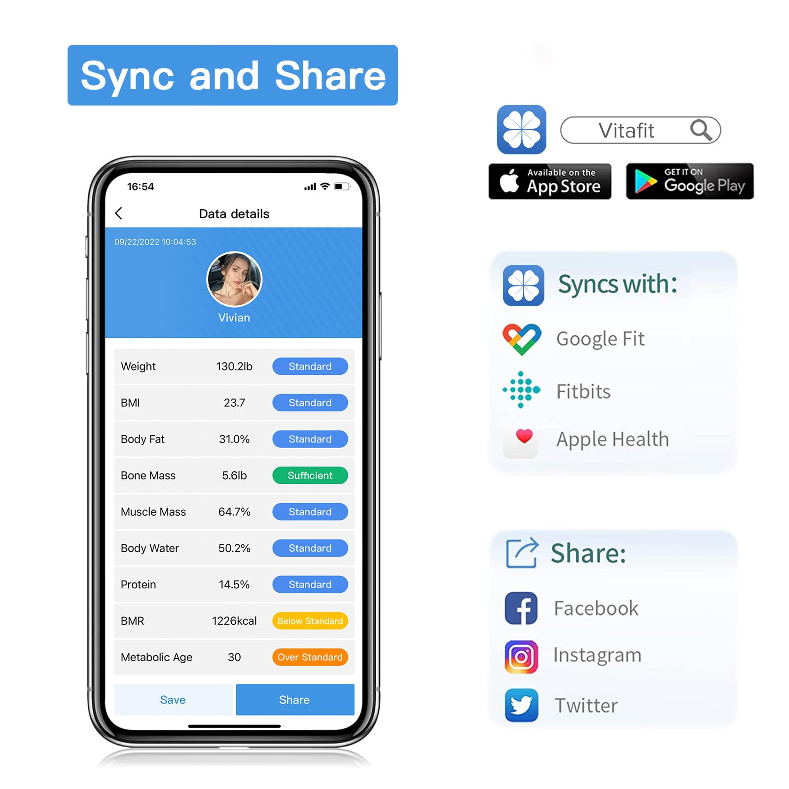 • SYNC AND SHARE - The digital weighing scale App is with professional UI for easily syncing your data with popular fitness apps Apple Health, Google Fit, and Fitbit to conveniently view your fitness graphs. What is more, easily sharing your progress on major social media platform.