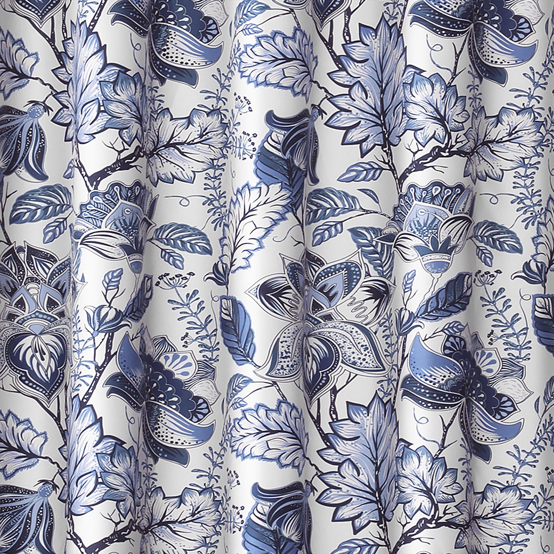 • Bold floral print pattern in shades of blue for a mix of modern and traditional style shower curtain.