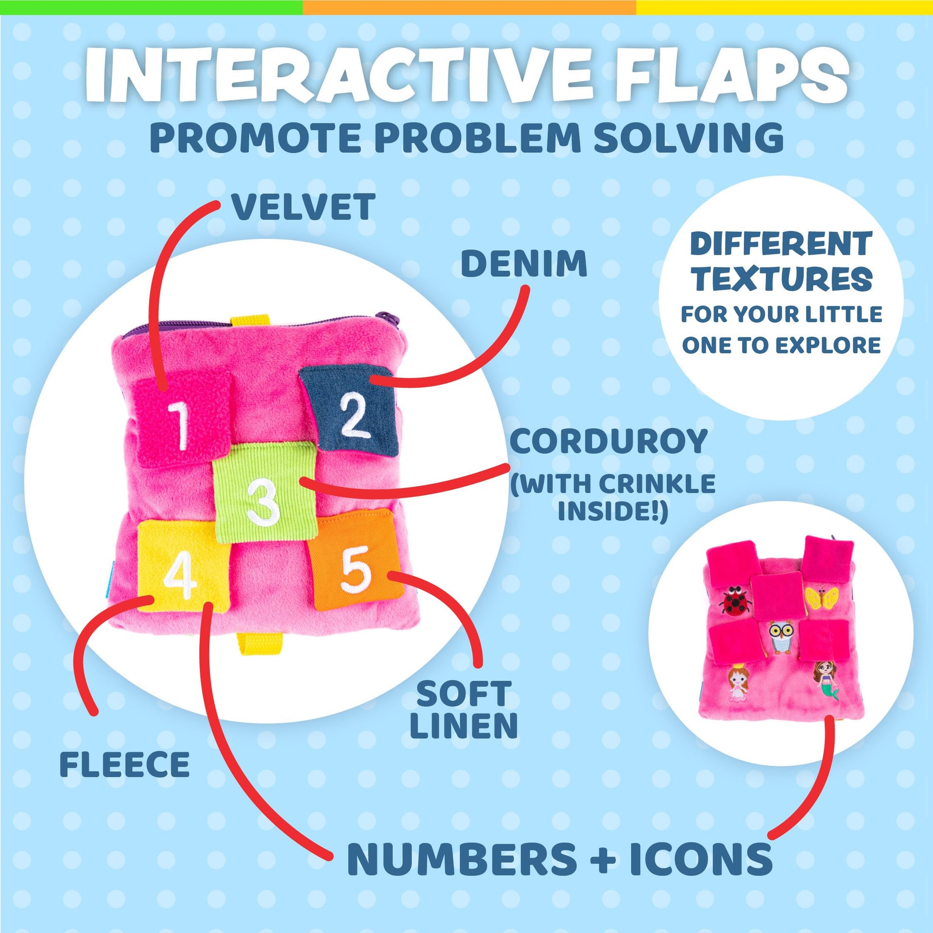 • SENSORY DETAILS: Teach your boy or girl early life skills with soft interactive flaps, numbers & shapes, a zipper pocket, & 6 color matching straps with different clasps. Measures 6.5” x 6.5”.