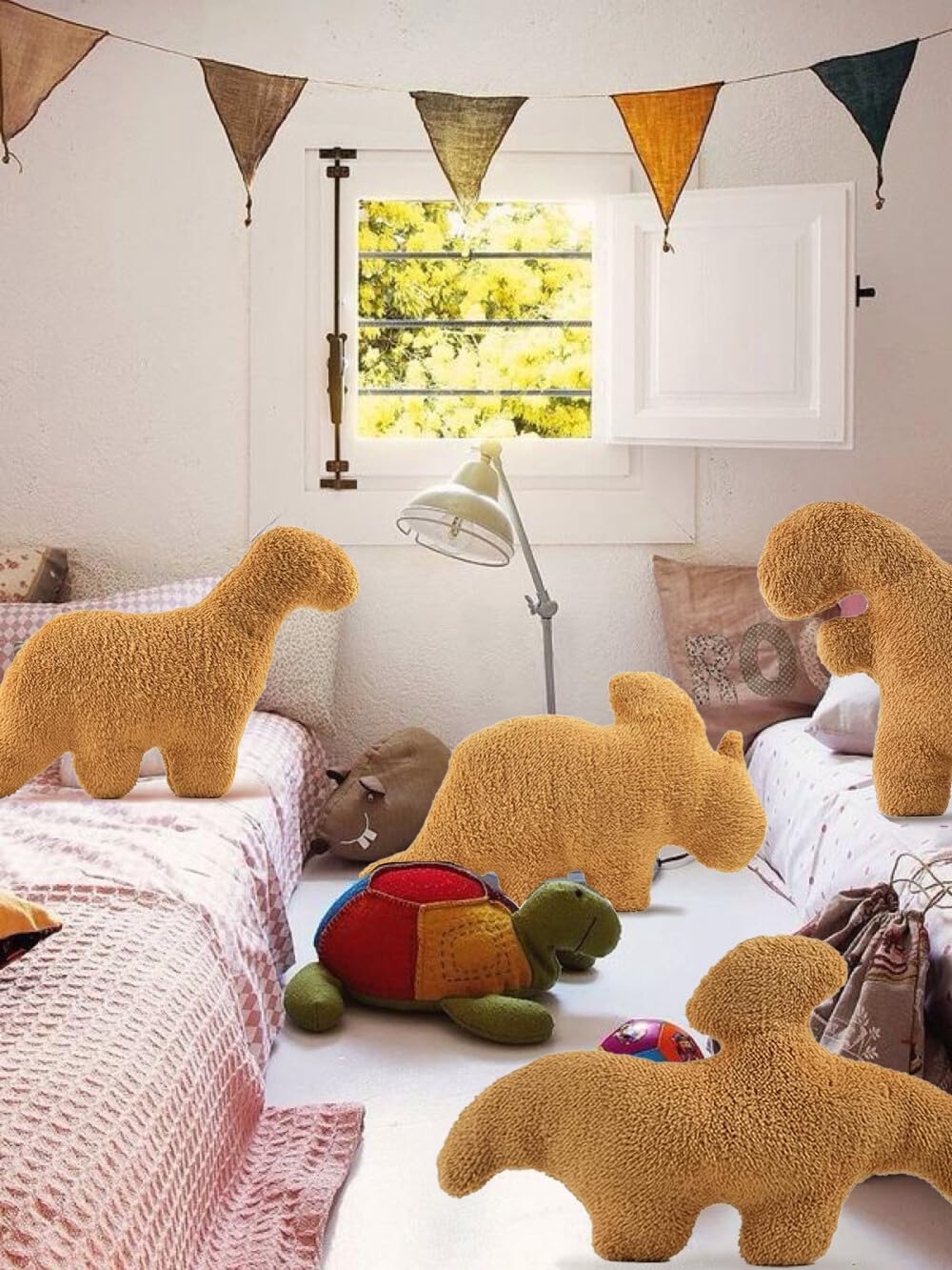 Our dinosaur chicken nugget pillow comes from the chicken nuggets in life,give it a vivid form and create it into a cute animal plush pillow. It is a very cute little dinosaur. Soft and high quality plush material will bring your children happiness. When children hug it, they will also be attracted by the color of the chicken nuggets. We have 3 different styles to choose from, Stegosaurus, Tyrannosaurus and Tanystropheus. By the combination of different dinosaurs into each different dino nuggets pillow plush will bring you endless fun.