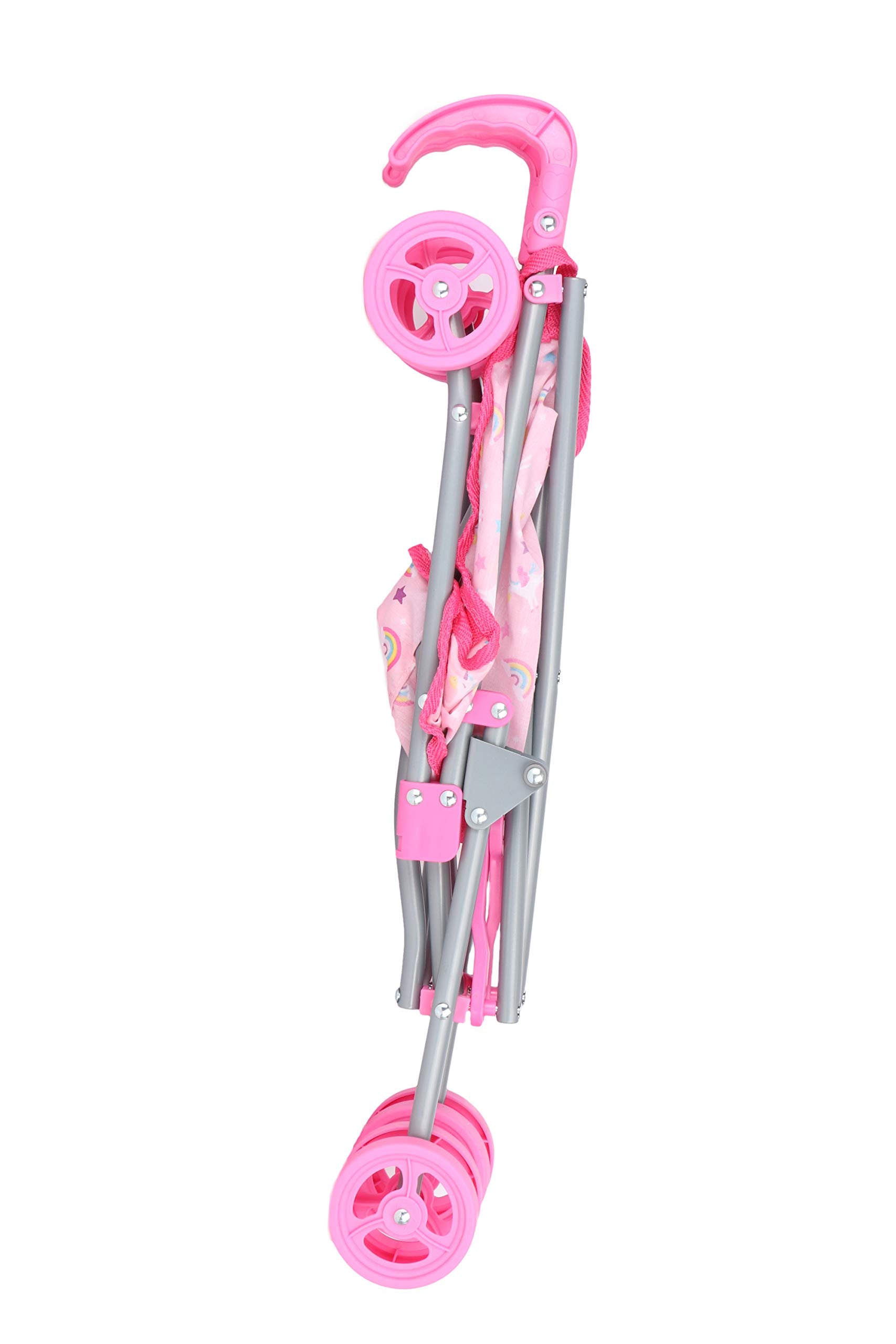 - STROLLER FOR BABY DOLLS - This pink rainbow and unicorn metal umbrella baby toy stroller has a safety lock and seat belt. It is perfect for creating special memories with their first friend. Fits up to 20’’ baby dolls