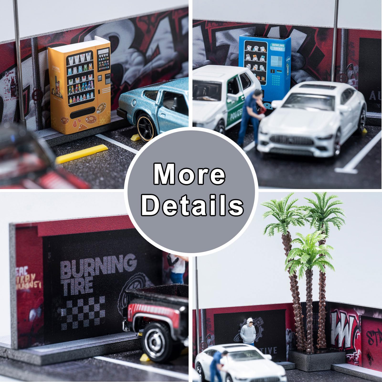 - 【Realistic Garage Scene】: This 1/64-scale garage emulates a genuine outdoor parking lot. The high-definition UV printing is employed to reproduce a realistic graffiti street scene. It provides 5 standard parking spaces for presenting your sports cars and collectible toy car models, Compatible with Matchboxes, GreenLight, Kyosho and Tomica. The distinctive atmosphere scene, you can enjoy presenting precious collectibles in your office or at home.