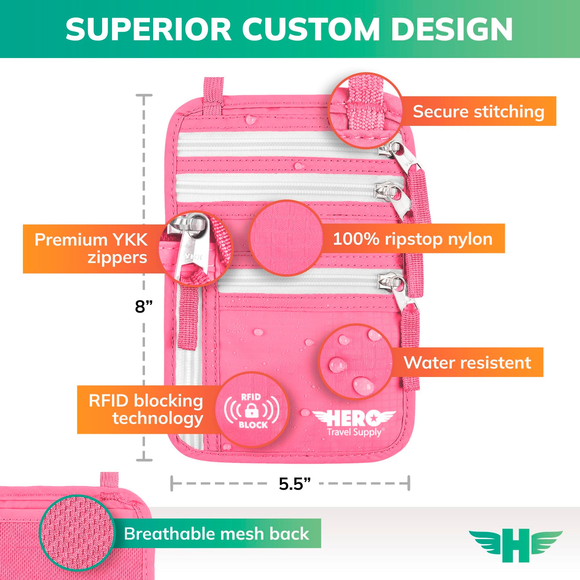 Hero Travel Supply Neck Wallet, RFID Blocking Passport Holder, Easy to Conceal Pouch (Hot Pink)