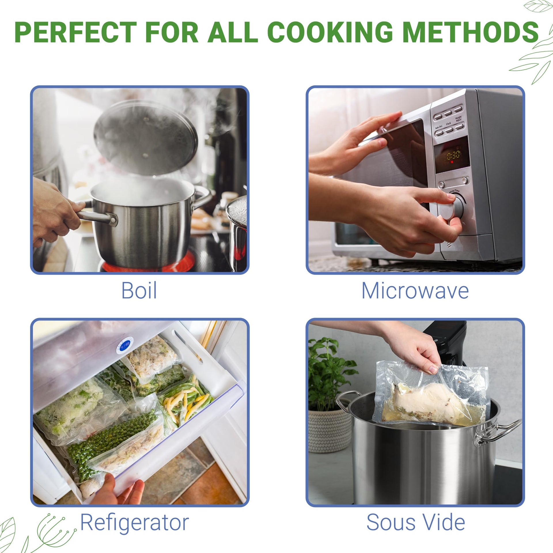 UNMATCHED VERSATILITY: Our pouches can be frozen, refrigerated, boiled or sous vide and even microwaved!